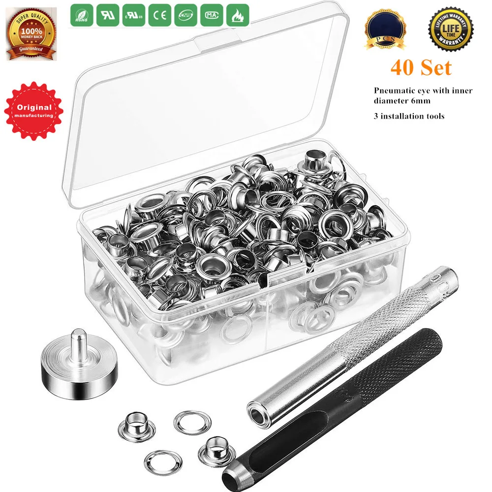 Размер: размер кнопки: внутренний диаметр 6 мм наружный диаметр 10 мм Посылка в комплекте (входит в одну коробку): 40 наборов застежек для глаз + 3 установочных инструмента (включая пробойник)