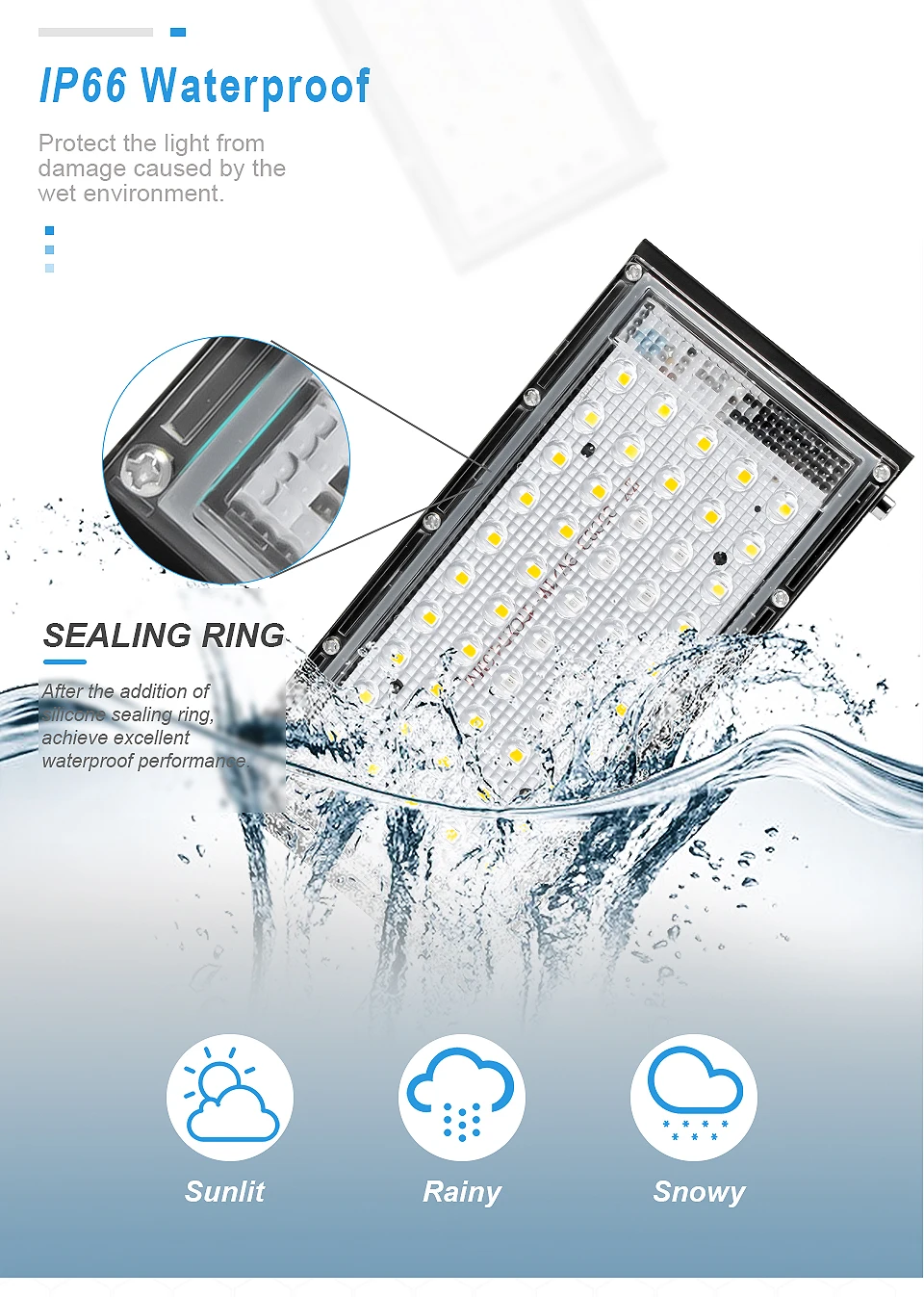IP66 водонепроницаемый-Он может защитить светильник от повреждений, вызванных влажной средой, например, снегом, дождем или влажной погодой.