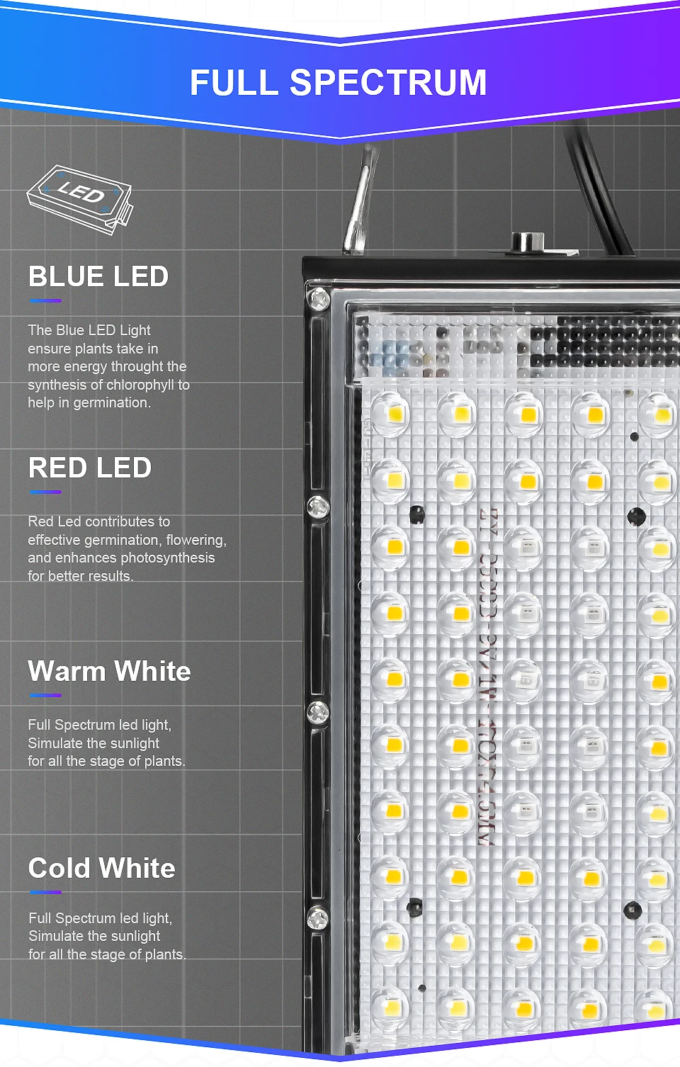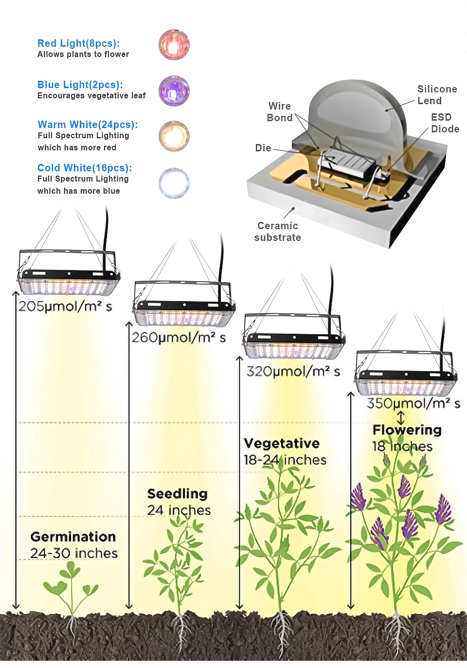 Без вентилятора и шума-Этот светильник для выращивания будет тихим, когда он будет работать без вентилятора и шума. Эта лампа оснащена автоматическим преобразователь температуры. Когда температура достигает определенной температуры, температура упадет.