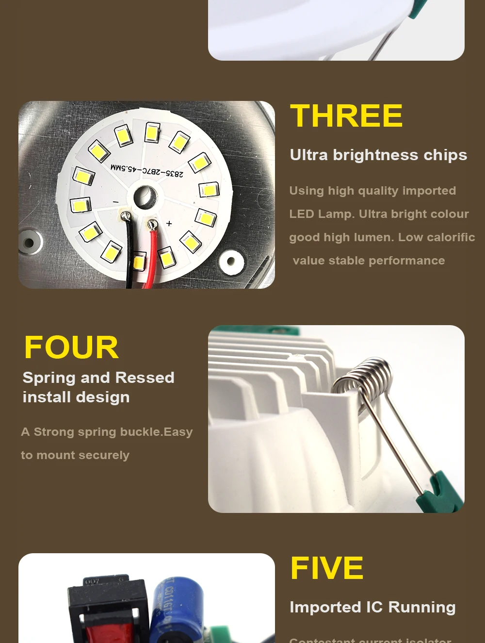 1. Постоянная схема c urrender drive, качество более стабильное, без мерцания, Широкий Входной AC90-260V напряжения (подходит для AC100V, 110V, 130V, 220V, 240V) более устойчивы к повреждениям, вызванным колебаниями напряжения компонентов освещения.