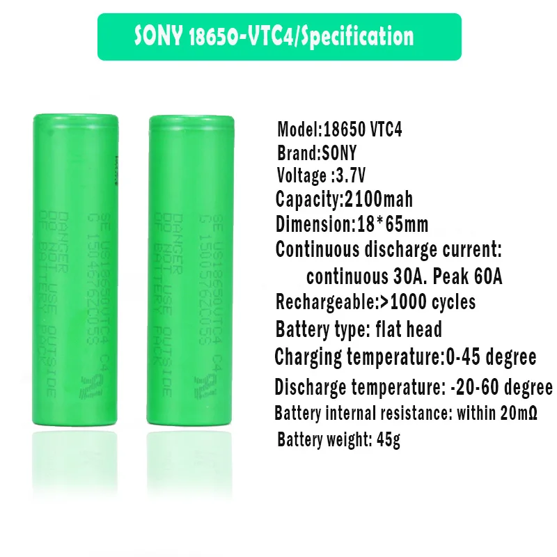 100% оригинал Sony US18650 VTC4 3,7 V 2100mah 30A разрядная литий-ионная аккумуляторная батарея для инструментов фонарика игрушки камера электронная сигаретаНазвание: Цилиндрический литий-ионный аккумулятор Sony 18650Модель: US18650VTC4Спецификация: 18*65 (мм)Материал: литий-ионный аккумуляторНапряжение: 3,6 VВнутреннее сопротивление: в пределах 20 МОмЕмкость: 2100 мАчВес: 45 гНепрерывный ток разряда: непрерывный 30A. Пик 60AТок зарядки: 2AТемпература зарядки: 0 ~ + 45 ℃Температура разряда: -20 ~ + 60 ℃Применимые типы: модель самолета, электрическая дрель, фонарик, электроинструменты, электромобили, связь, медицина, хранение энергии, военные и т. Д.Для зарядки и разрядки стандарт: более чем в 1000 раз, предельное напряжение зарядки составляет 4,2 V, и разрядки напряжение отсечки является 2,5 V.Предупреждения:-Не перегружать/не перегружать-Перезарядка сливается как можно скорее-Не играйте с огнем-Не подвергать воздействию экстремального тепла или воды.Ознакомьтесь с обработкой литий-ионных батарей перед покупкой.Использование: электронная сигарета, электроинструменты, электромобили, электрооборудование, фонарик, высокая мощность