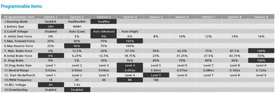 • Настраиваемый тормоз сопротивления и скорость сопротивления тормоза для различных транспортных средств, треков и контроля. Регулируемая частота PWM в сочетании с передовой технологией freewheeling (/DEO) гарантирует большую линейность дроссельной заслонки и ощущение вождения.