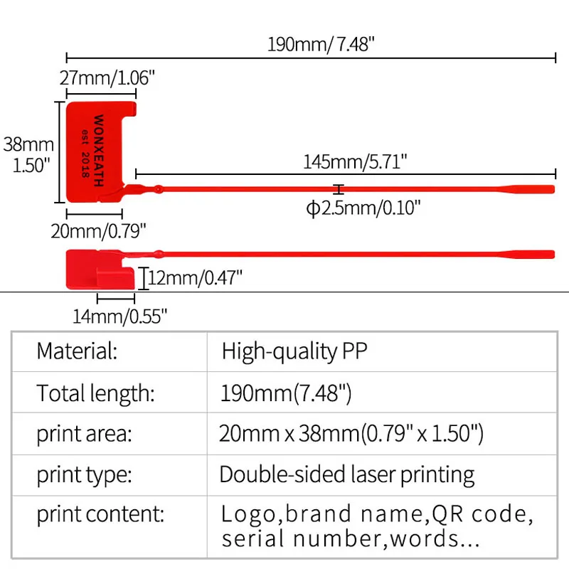 ➤Тип: одноразовые пластиковые фирменные бирки ➤Цвет: белый/синий/красный/желтый/зеленый/розовый/черный/оранжевый ➤Quantity: 100 шт./лот Material Материал: высококачественное ПП сырье ➤Total Длина: 190 мм/7,5" ➤Площадь печати: 34 мм * 22 мм (1,34 ”* 0,87”) ➤Технология печати: Двусторонняя лазерная печать ➤Характеристики продукта: прост в использовании, может порваться вручную.