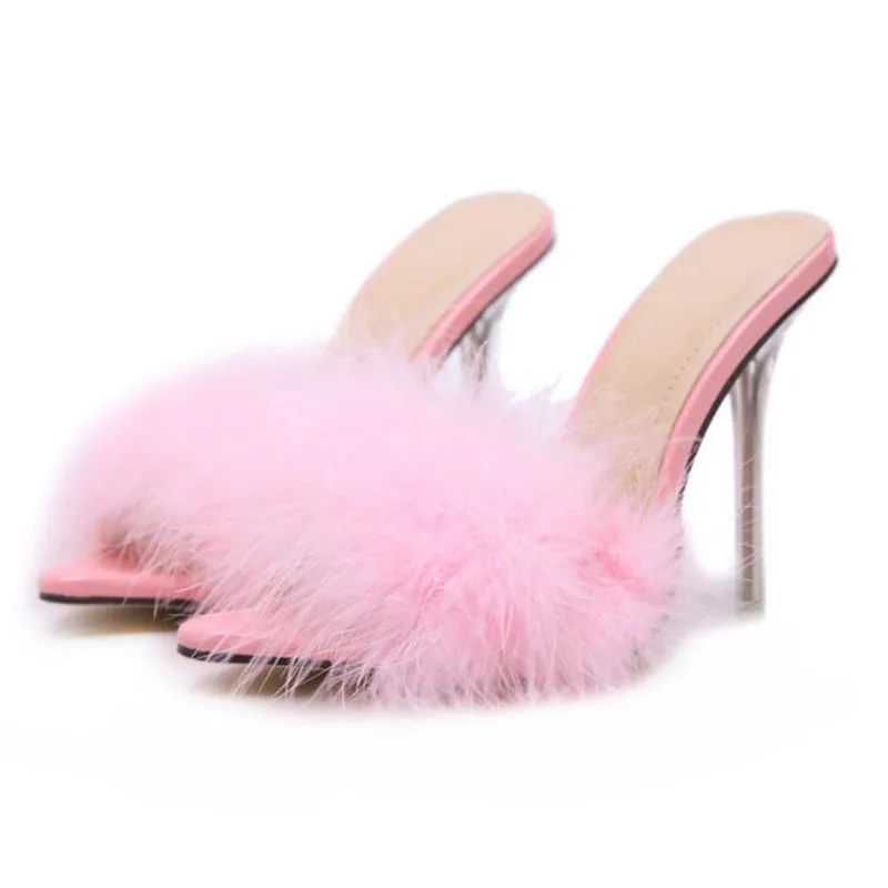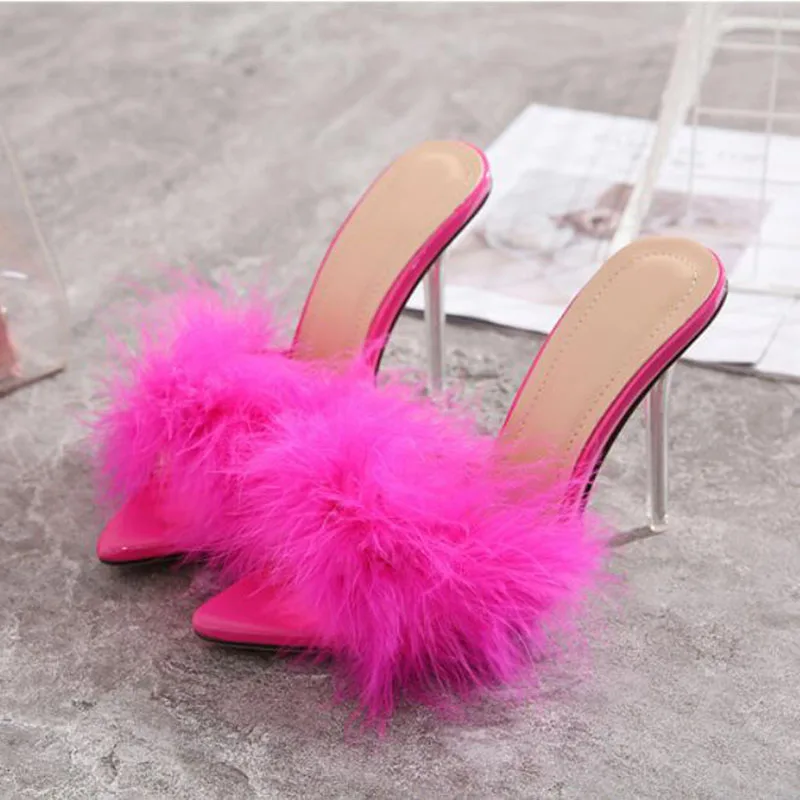 Summer Fashion Women Pumps Thin Heels Mules Shoes Faux Fur Pointed Toe Fashion Slippers For Women Black Pink White Size 41