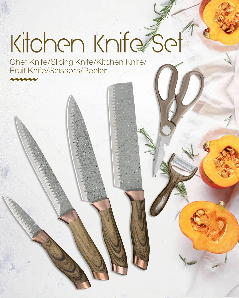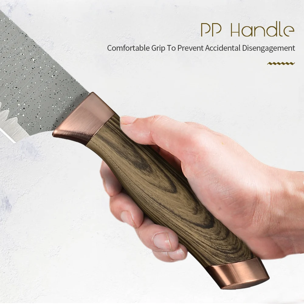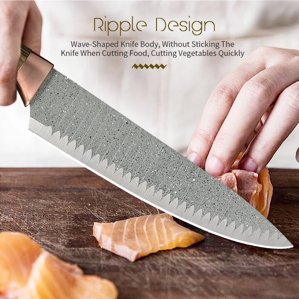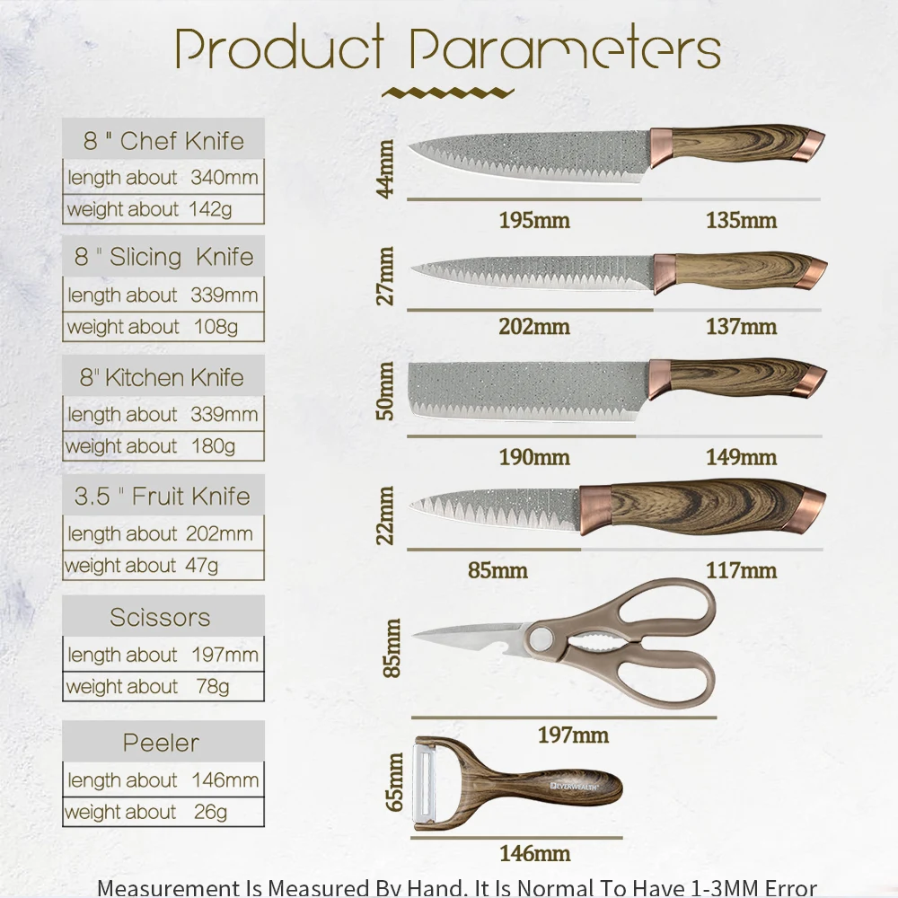1x8 дюймов нож шеф-повара 1x8 дюймов нож для нарезки 1x8 дюймов разделочный нож 1x3,5 дюймов нож для фруктов 1 x Ножницы 1 х очистки фруктов и овощей 1 x Подарочная коробка