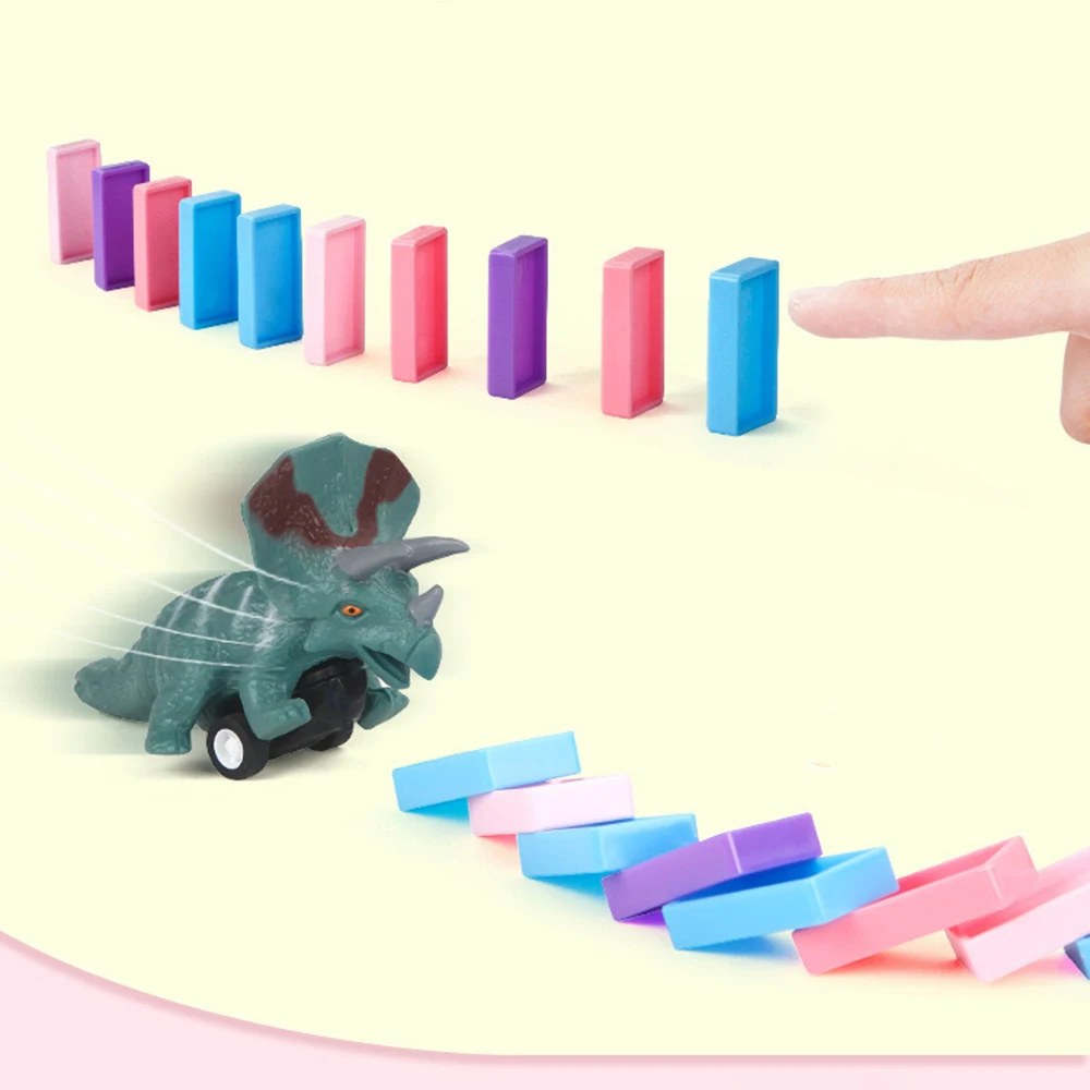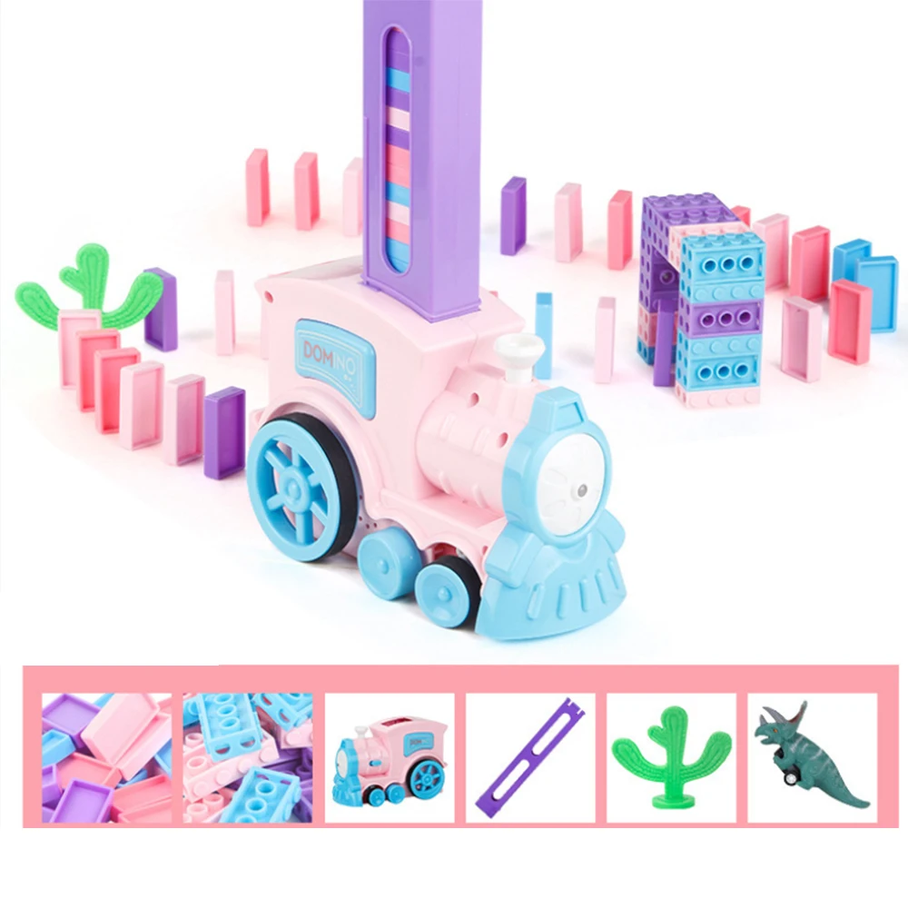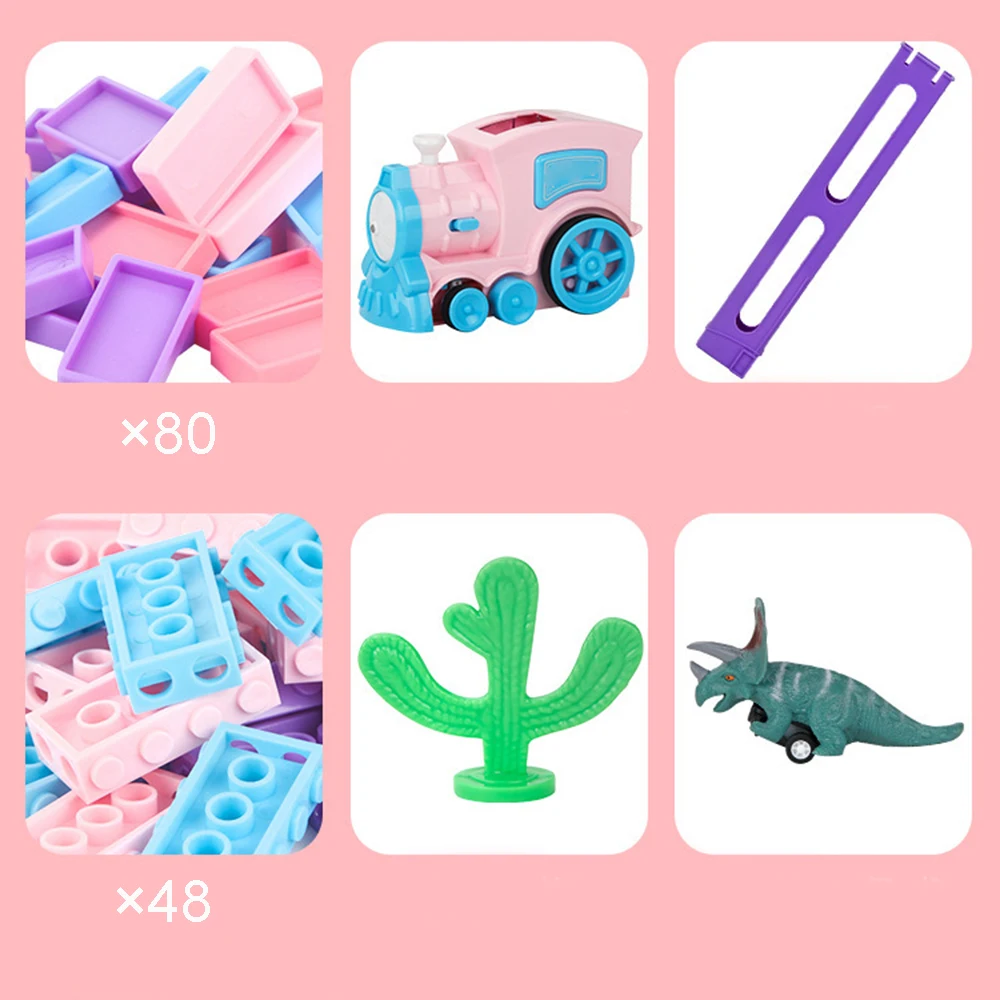 – Build your desired domino race track with 80 pieces of colorful plastic blocks. Super fun for your kids to play! Set them up all in a row, and then push one and watch the chain effect of the dominoes tumbling over like a race.