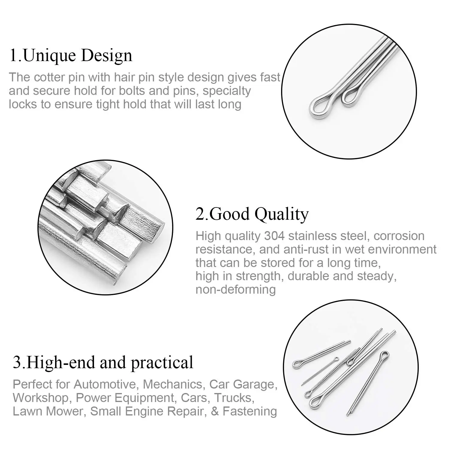 🔩Сверхпрочный материал обеспечивает долговечность, а дизайн заколки для волос обеспечивает быструю и надежную фиксацию болтов для обеспечения стабильности 🔩Набор содержит широкий диапазон размеров: 1/16 "x1" и 3/32 "x 1", 3/32 "x1-1/2", 1/8 "x1-1/4", 1/8 "x 2", 5/32 "x1-1/2" 【 Высокое Качество 】 --- изготовлен из высококачественной нержавеющей стали 304, Коррозионностойкий, прочный и устойчивый, высококачественные материалы и конструкция для обеспечения длительного срока службы. [Хороший дизайн] --- штифтовый штифт изготовлен из сверхпрочного материала, с дизайном штифта для волос обеспечивает быструю и надежную фиксацию болтов и штифтов, специальные замки для обеспечения плотного удержания, которое прослужит долго. 【Легко использовать 】 --- когда гайка затягивается, поместите штифт в гаечную канавку и хвостовое отверстие болта и вытяните хвостик штифта, что может предотвратить относительное вращение гайки и болта. 【Широкое применение 】 --- Простота в использовании, идеально подходит для автомобиля, механики, гаража автомобиля, мастерской, силового оборудования, автомобилей, грузовиков, газонокосилки, ремонта небольших двигателей и крепления. 【Specifications:】 -Цвет: серебро -Материал: высококачественная нержавеющая сталь 304 -Тип товара: высококачественный зажим для ключей, застежка для ключей 【Features:】 √ 1, изготовлен из высококачественной нержавеющей стали 304, устойчивый к коррозии, прочный и устойчивый. √ 2, Сверхпрочный материал обеспечивает долговечность, а дизайн заколки для волос обеспечивает быструю и надежную фиксацию болтов для обеспечения стабильности. √ 3, штифт-штифт изготовлен из сверхпрочного материала, с дизайном штифта для волос обеспечивает быструю и надежную фиксацию болтов и штифтов, специальные замки для обеспечения плотного удержания, которое прослужит долго. √ 4, простота в использовании, идеально подходит для автомобилей, механиков, гаража, мастерской, силового оборудования, автомобилей, грузовиков, газонокосилок, ремонта небольших двигателей и крепления. 🔩-Все штифты упакованы в прозрачный пластиковый чехол, каждый размер держится в отдельном месте 🔩-Сверхпрочный материал обеспечивает долговечность, а дизайн заколки для волос обеспечивает быструю и надежную фиксацию болтов для обеспечения стабильности 🔩-Высококачественный материал из нержавеющей стали 304, может быть в горячей влажной и различной коррозионной среде для долгосрочного использования 🔩-Широкое применение: Идеально подходит для автомобилей, механиков, гаража, мастерской, силового оборудования, автомобилей, грузовиков, газонокосилок, ремонта небольших двигателей и крепления