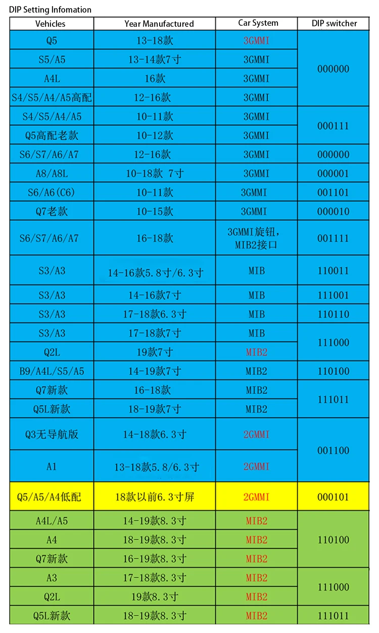 Compatible Vehicles : AUDI A3 Q2 S3 RS3 A4 A5 Q5 A6 A7 Q7 A8 with MMI 3G / 3G Plus system