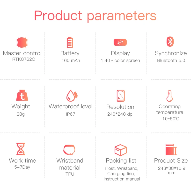 6. Водонепроницаемость IP67, повседневная одежда не боится воды, новая технология герметизации имеет хорошую водонепроницаемость и обеспечивает ежедневную Водонепроницаемость (Примечание: коррозионные жидкости, такие как горячая вода, химическое моющее средство и морская вода не поддерживаются). 7. Прогноз погоды всегда уделяет внимание тому, находится ли он в помещении или на улице, надев часы, может справиться с текущими погодными условиями в городе. 8. Длительный срок службы батареи не требует частого заряда. Встроенные высококачественные полимерные энергосберегающие батареи, 5-7 дней нормального использования, длительный срок службы батареи, удобная зарядка через USB.