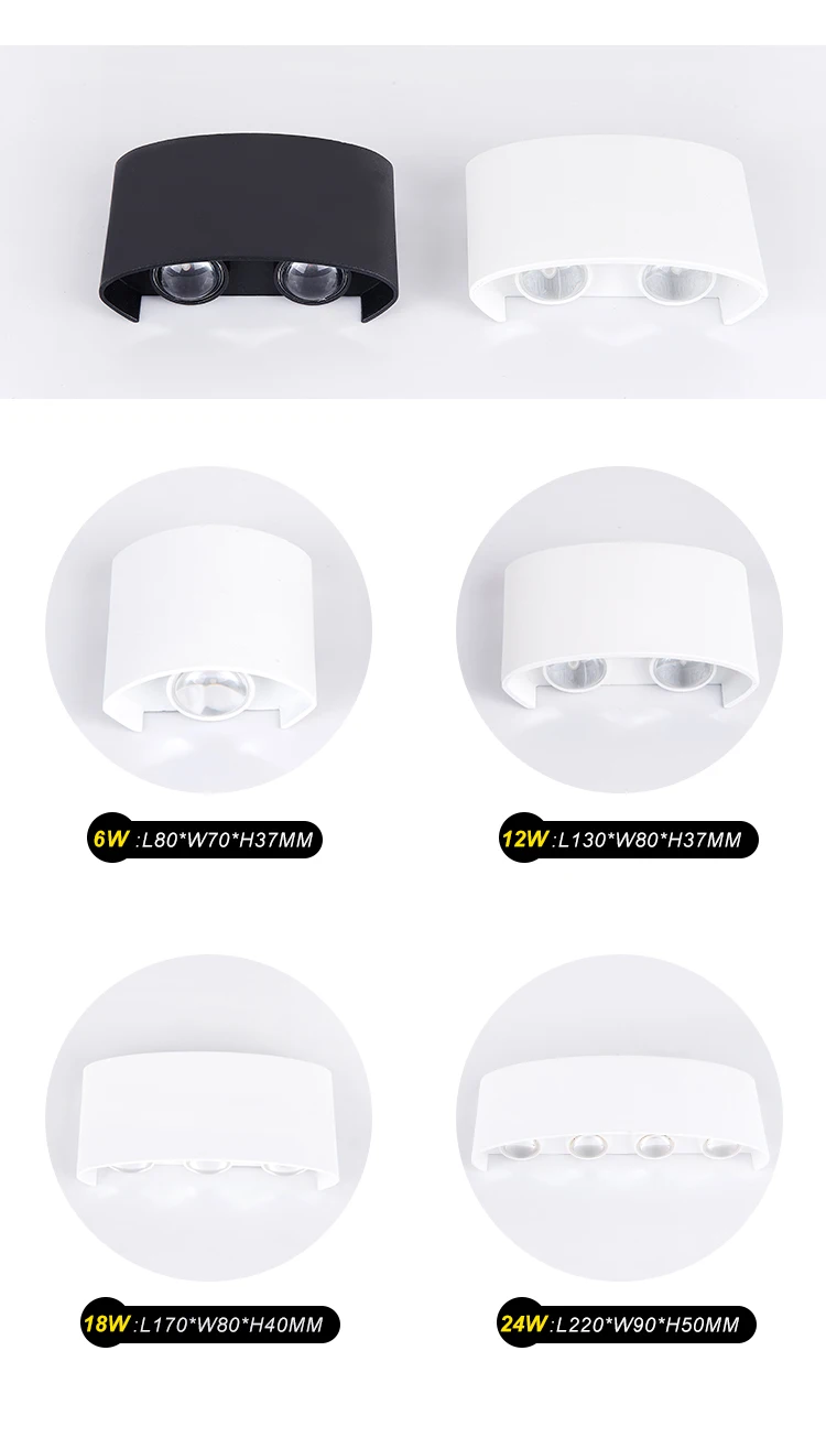 1. Мощность: 6 Вт/12 Вт/18 Вт/24 Вт 2. Чип: светодиодный чип 3. Цвет излучения: COB 4. Цвет корпуса: белый/черный 5. Вход напряжение: 85-265 В переменного тока, 50/60 Гц 6. Материал корпуса: алюминий 7. Размеры: 6 Вт: 77*80*32 мм 12 Вт: 120*80*37 мм 18 Вт: 170*80*40 мм 24 Вт: 220*80*44 мм 8. Люмен: светодиодный чип 100-120лм/Вт