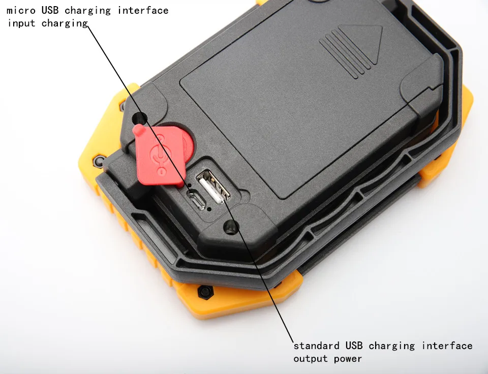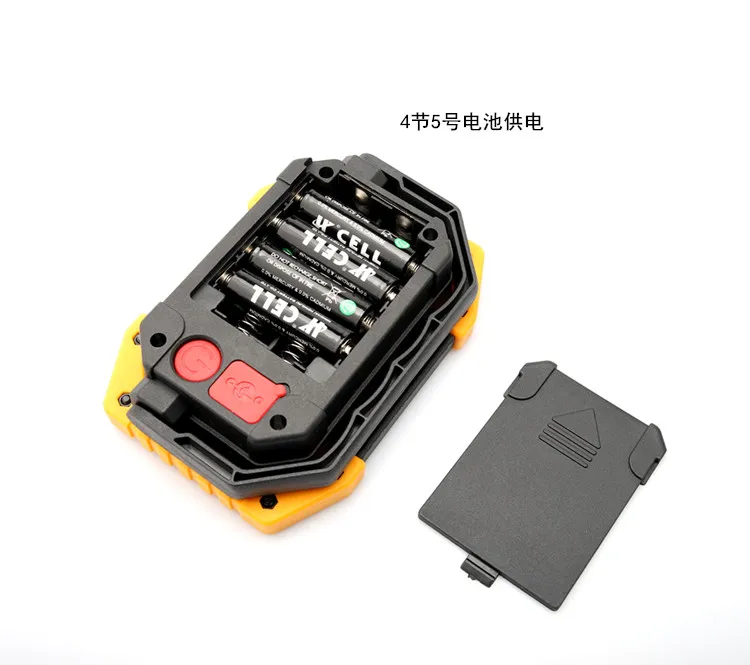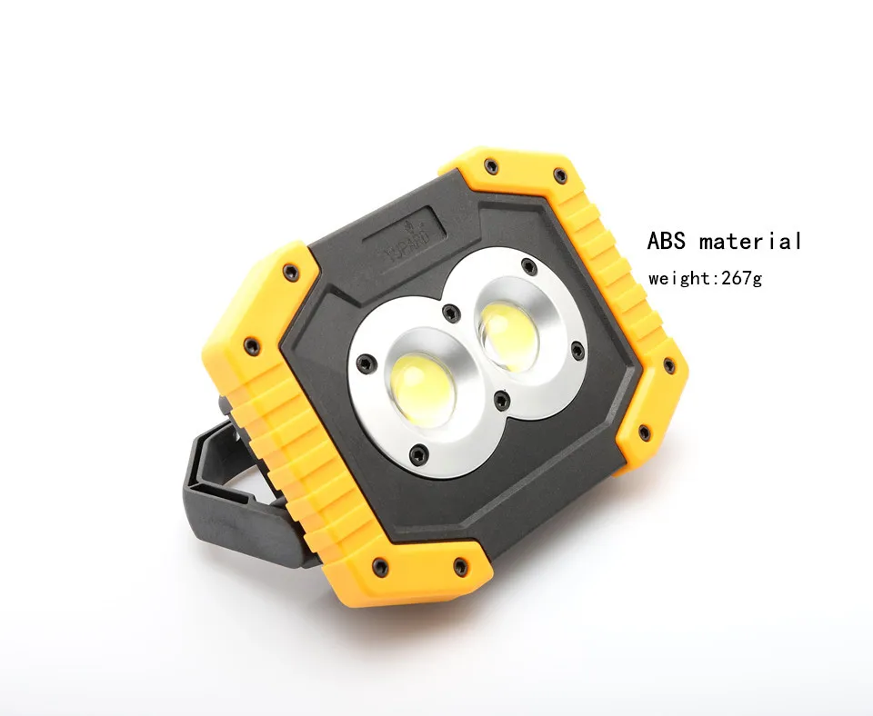 1. Product material: ABS plastic 2. Lamp beads: 2 * COB LED 3. Power: 20W 4. Input voltage: 5V 5. Color rendering index: 80 6. Light angle: 120 degrees 7. Product weight: 267g 8. Product size: 135 x 100 x 40mm 9. Protection level: IP44 10. Color temperature 6,500K (cool white) 11. Lighting time: 8-12 hours 12. Charging time: 4-6 hours 13. Battery power: 2 * 18650 rechargeable battery / 4 * AA battery(did not include) 14.3 mode: strong light-weak light-flash