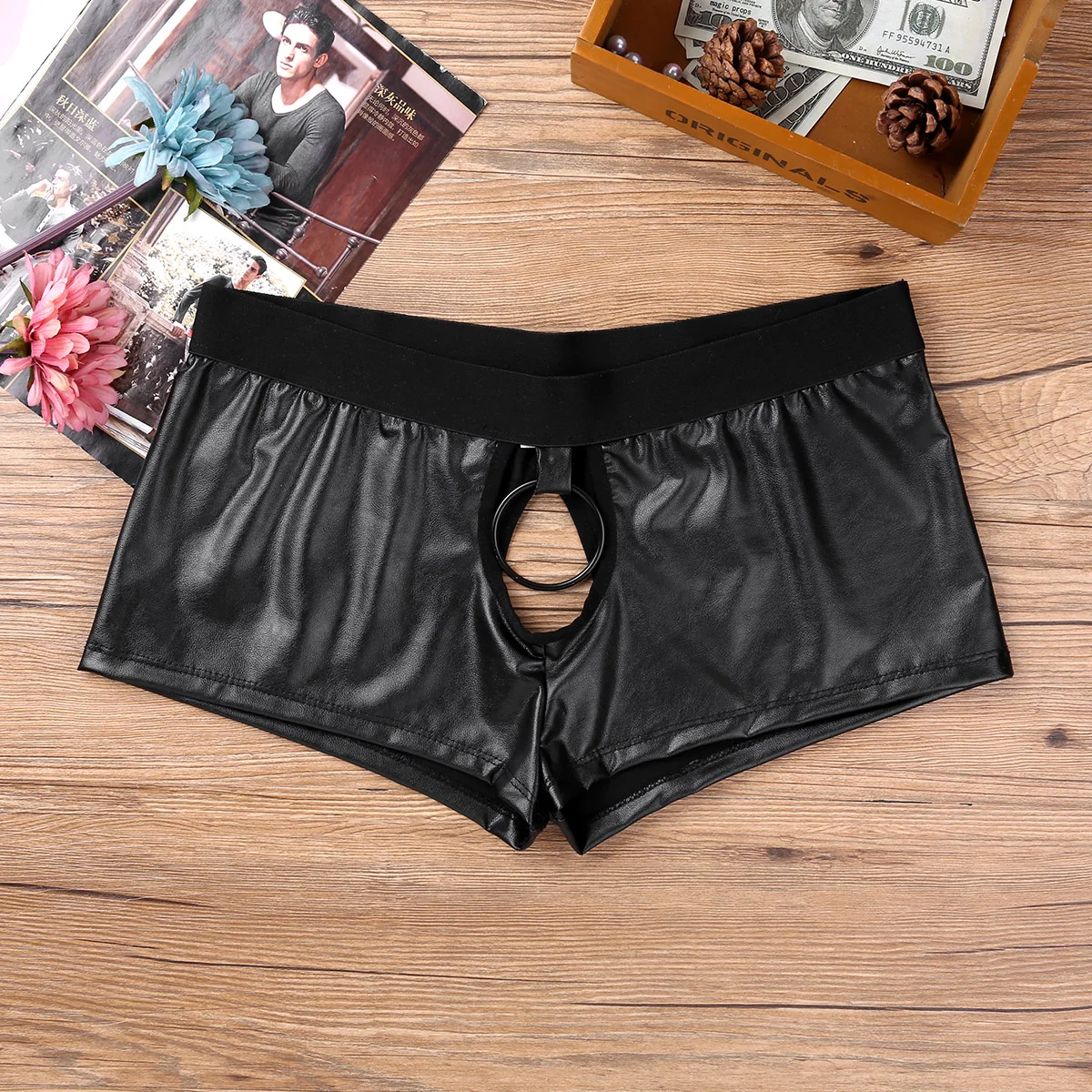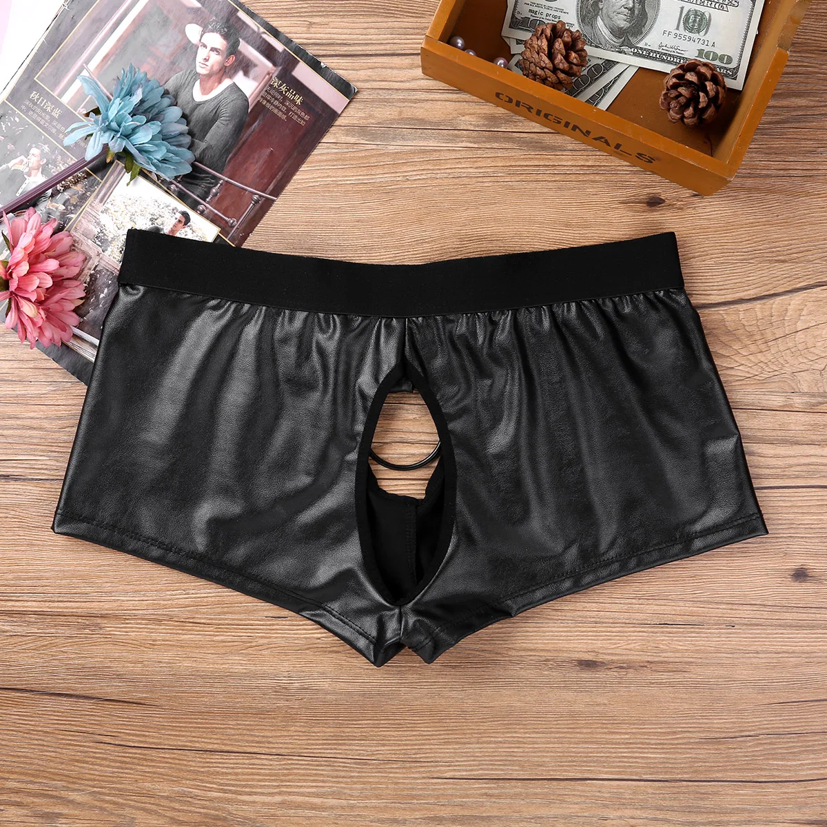 Мужские боксеры, шорты, Wetlook, из искусственной кожи, с вырезами, с низкой посадкой, сексуальное мужское нижнее белье, трусы с металлическим уплотнительным кольцом, нижнее белье