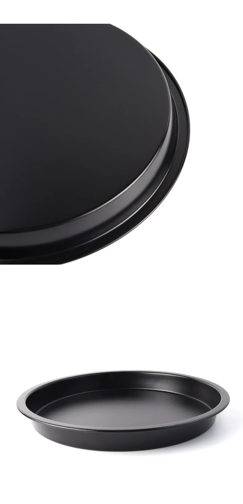 This pizza baking pan is made of carbon steel and has a non-stick coating on the surface. Through SGS testing, can directly contact food.