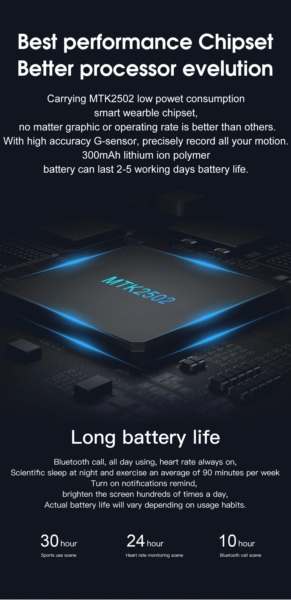* 1,3 дюйма HD полный сенсорный экран * Встроенный аккумулятор 290 мАч, время работы в режиме ожидания 7 дней * Поддержка Bluetooth 4,0, iOS 8,4 версия выше и Android 4,4 версия выше * Водонепроницаемость IP68: можно носить во время мытья рук или под дождем, но не использовать для купания или ванны.