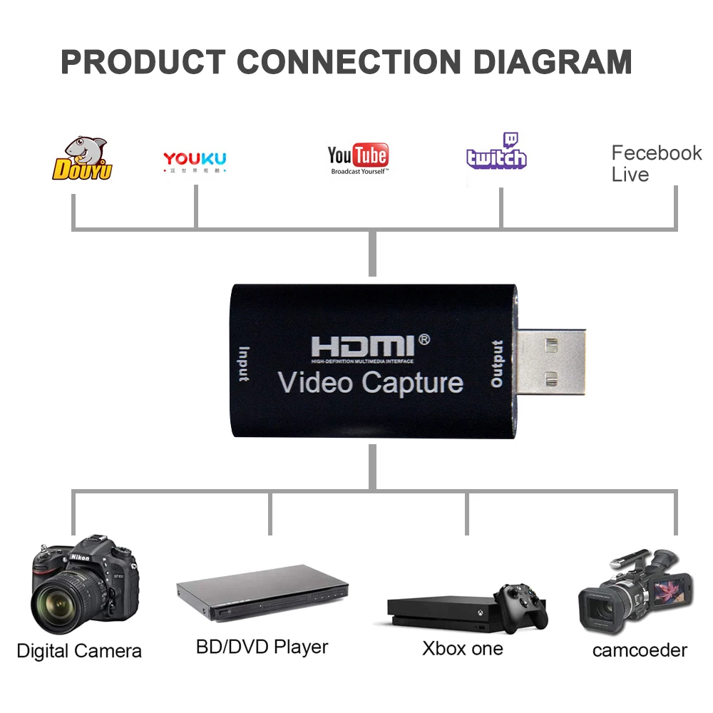Эта карта сбора USB 2,0 может одновременно записывать как HDMI видео, так и HDMI аудио. Он может передавать аудио и видео сигналы на компьютеры и смартфоны для предварительного просмотра и хранения. Подходит для получения HD, обучения записи