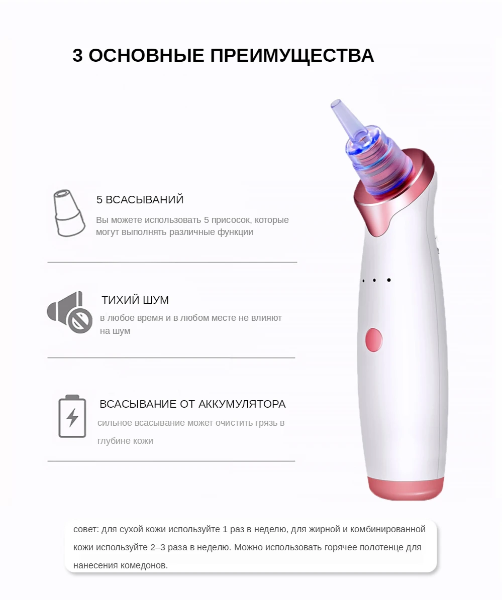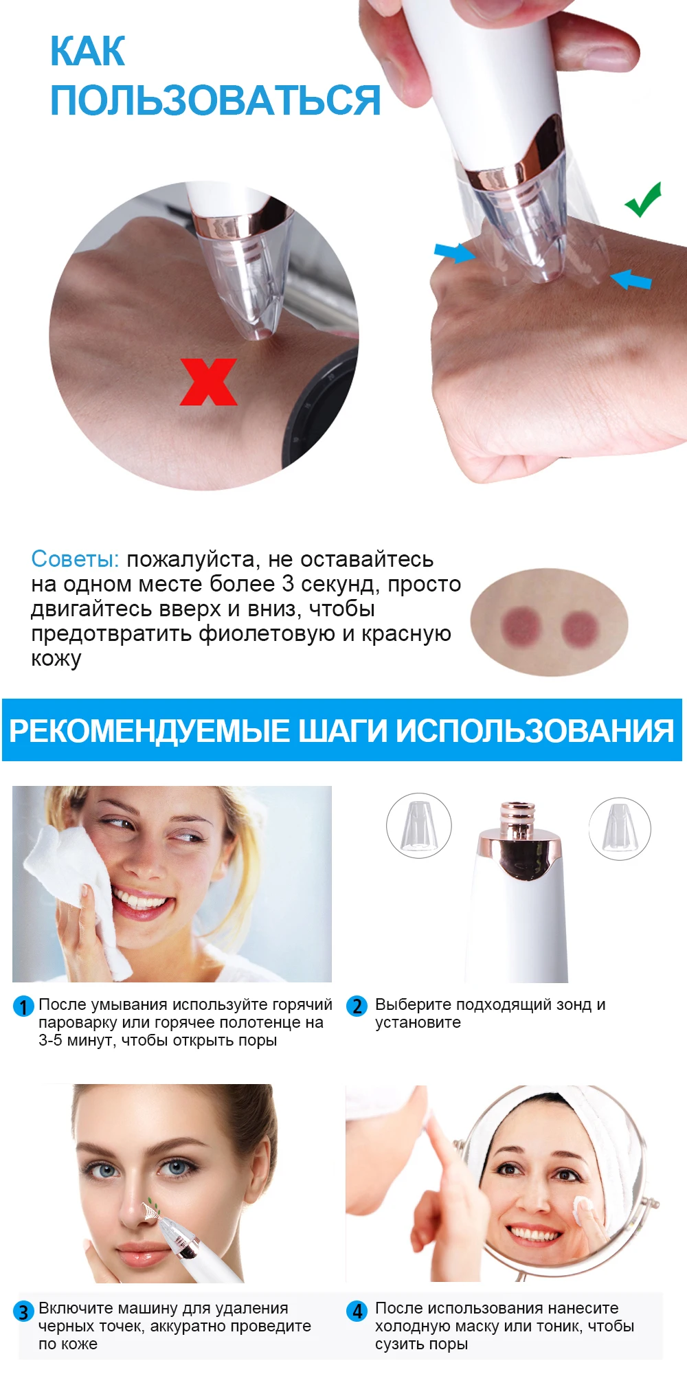 Средство для удаления угрей, уход за кожей, очистка пор, вакуумное удаление прыщей, прыщей, вакуумное всасывание, алмазная дермабразия для лица, машина Описание: 1. Согласно эргономике, когда сила адсорбции кожи превышает 150 кПа, кожа будет растягиваться и повреждаться, что приводит к покраснению, расширению пор и другим проблемам. Наш инструмент для удаления черных точек имеет мощность 55-100 кПа, что не повреждает кожу при удалении черных точек. , 2. Три вида подсказок для разных участков кожи. 3. Маленькое круглое отверстие: подходит для хрупкой чувствительной кожи и мест, где большое круглое отверстие не впитывается. Наконечник с большим круглым отверстием: в дополнение к области вокруг глаз его можно использовать для удаления черных точек, прыщей, жира. Наконечник овальной формы: можно наносить на уголки глаз, рта, носа или на шею. 4. Сухая кожа один раз в неделю, жирная или смешанная кожа два раза в неделю. Шаги по использованию: 1. Перед использованием смойте лицо теплой водой, затем нанесите теплое полотенце на лицо или воспользуйтесь паром, чтобы нагреть лицо в течение 5–10 минут. Перед использованием подождите, пока не откроются поры. (Если у вас есть экспортная эссенция от черных точек, вы можете нанести ее на нос примерно на 5-10 минут) 2. Выберите правильный зонд и установите его. 3. Включите машину для удаления черных точек, аккуратно проведите по коже. 4. Наконец, нанесите Pore Care Essence на 15 минут, чтобы сузить поры. или нанесите холодную маску или тоник на машину, чтобы сузить поры Технические характеристики: Материал: АБС-пластик Вес нетто: 105 г Источник питания: USB-зарядка Размер изделия: 17,5 * 4 * 4 см Используйте мощность: 5 Вт В комплект поставки входят: 1 * Вакуумный электрический очиститель для удаления черных точек (основной блок) 3 * сменная всасывающая головка 1 * USB-кабель 1 * Руководство пользователя