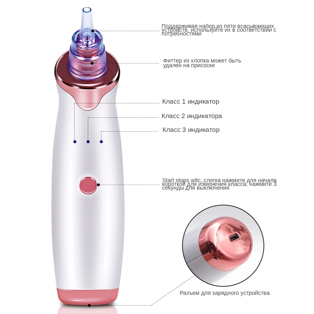 Средство для очистки пор лица Средство для удаления черных точек Вакуумный очиститель для удаления прыщей Устройство для удаления прыщей Уход за кожей Косметический инструмент Характеристики 1. [Безопасно и эффективно] Применяйте инновационную усовершенствованную технологию вакуумного всасывания для сверхсильного всасывания, чтобы легко высасывать черные точки, белые точки, мертвую кожу, остатки макияжа, прыщи и прыщи, не повреждая кожу, не раздражая и безболезненно, чтобы избежать побочных эффектов. , 2. [Многоцелевое применение] 3 регулируемых уровня всасывания и 6 сменных всасывающих головок для свободной регулировки, широко подходят для разных типов кожи и работают на разных участках кожи, полностью удовлетворяют ваши индивидуальные требования к очистке пор. 3. [Простое управление] Управление одной кнопкой, вы можете удобно включать / выключать и переключать ступени всасывания, удобство в использовании для мгновенного удовольствия. 4. [Четкая индикация] Светодиодный дисплей высокой четкости обеспечивает прямую индикацию уровней всасывания, оставшегося заряда батареи и рабочего состояния для монитора в реальном времени, чтобы подготовиться к следующему использованию. 5. [Стабильное энергопотребление] Встроенный полимерный аккумулятор емкостью 380 мАч можно заряжать с помощью USB-зарядки, вы можете практически получить доступ к источнику питания через ПК, планшетный компьютер, адаптер, блок питания и другие устройства с поддержкой USB. 6. [Надежное качество] Эргономичный обтекаемый корпус и высококачественный материал АБС обеспечивают удобные захваты, долговечные для длительного использования. 7. [Компактный размер] Легкая и портативная конструкция, подходит для использования дома и в поездках с легким ветерком. Характеристики Материал: АБС-пластик Цвет корпуса: белый Рабочее напряжение: 5 В Сила всасывания: ≦ 62 кПа Напряжение зарядки: 5 В Входная мощность: 2,5 Вт Номинальное напряжение: 3,7 В Тип батареи: аккумуляторная полимерная батарея 380 мАч Источник питания: зарядка через USB Время зарядки: около 90 минут Вес нетто: 125 г В комплект поставки входят: 1 * Вакуумный электрический очиститель для удаления черных точек (основной блок) 6 * сменная всасывающая головка 1 * USB-кабель 1 * Руководство пользователя