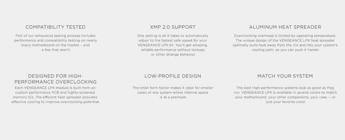 1. Память Vengeance LPX предназначена для высокопроизводительного разгона; Теплораспределитель изготовлен из чистого алюминия для более быстрого рассеивания тепла, а восьмислойная печатная плата помогает управлять нагревом и обеспечивает превосходное разогревание изголовья 2. Совместимость с сериями Intel 100, Intel 200, Intel 300 Series, Intel X299,AMD 300 series, AMD 400 series 3. Совместимость протестирована на материнских платах серии 100 для надежной быстрой производительности Поддержка XMP 2,0 без проблем, автоматический разгон. Нагреватель: анодированный алюминий 4. Скорость SPD: 2133 МГц; Посылка Pin-код памяти: 288; Совместимость: Intel 100 Series, Intel 200 Series, Intel 300 Series, Intel X299, AMD 300 Series, AMD 400 Series, AMD X570