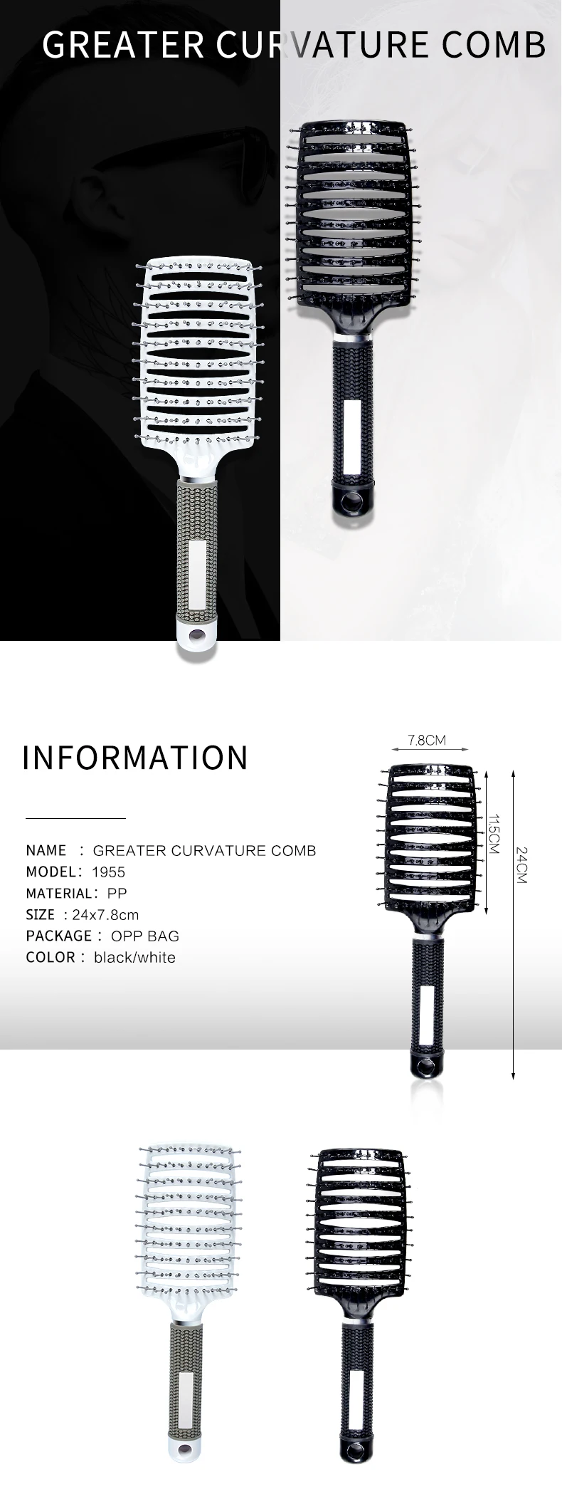 Большие изогнутые парикмахерские гребень, в форме зубная щетка с рукоятка покрыта нескользким материалом, цельная конструкция кисточки Парикмахерская аксессуар, уход за волосами, 1955