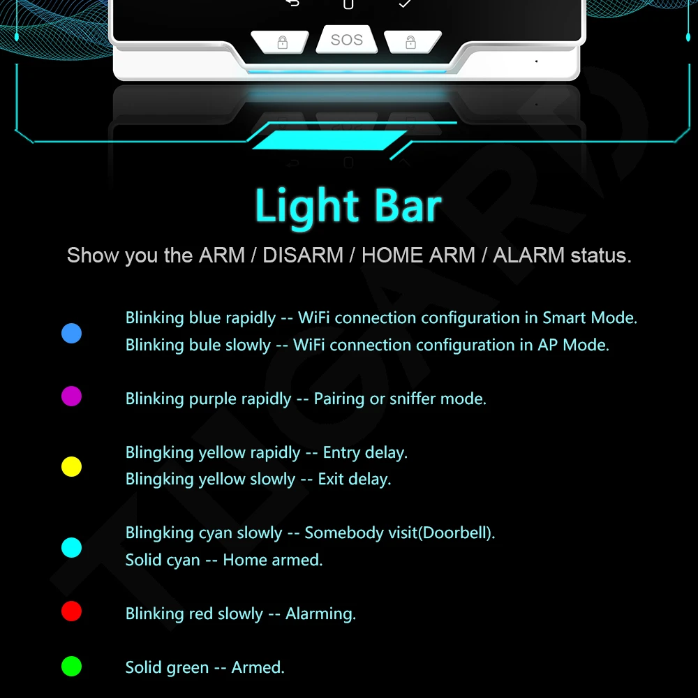1. Быстрый мигающий синий-конфигурация подключения WiFi в умном режиме. Медленно мигает синий-конфигурация подключения WiFi в режиме AP. 2. Быстрый мигающий фиолетовый-режим сопряжения или нюхера. Быстро блестящий желтый-задержка входа. Медленно светится желтым-Задержка выхода. 3. Медленно Blingking cyan-кто-то посетит (дверной звонок). Твердый голубой-домашний вооруженный. 4. Медленно мигает красным-тревожный. 5. Однотонный зеленый-вооруженный.