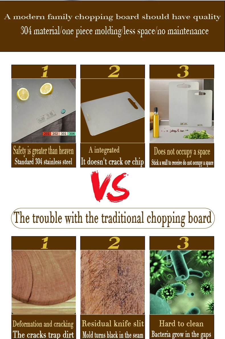 Особенности: Без плесени, без грязи, без сколов, без запаха, утолщение, сильный антибактериальный эффект Качество: безопасность современного бытового разделочного блока из-за большого прохода (стандартный 304 материал из нержавеющей стали), интегрированный (не сбрасывает крошки, не трескается), не занимает места (стена получает, не занимает место), не требует технического обслуживания, по сравнению с традиционными разделочными досками: деформационная трещина (Crack shelter злые люди и практики), остаточный нож шва шитья класса черной формы (dao), трудно очистить разрыв предстоящий (чистый) Мясо: Режьте мясо так просто, низкий уровень децибел режущего мяса звук для вас, чтобы создать комфортную среду для приготовления пищи Отрежьте фрукты: Разрежьте фрукты так легко, без крошек на доске, не скрывайте грязь, с порезом Ешьте Раскатать: разминать раскатать хороший помощник, не скрывать грязь легко чистить Очистка: Шелковая гладкая поверхность, смыв, который очищается, натуральный воздух может быть сухим, без обслуживания Изысканная продукция изготовлена из изысканного создания деталей: Изысканное шлифование кромок, внутреннее отверстие вокруг использования немецкой технологии лазерной полировки, гладкие и круглые углы могут быть человеком, человек влюбится. Матовая поверхность, поверхность процесса запотевания снега, шелковистая, легко моется, вес анти-рыбы. Утолщенный дизайн, продукт принимает утолщение пластины в целом, толщина до 2 мм, без трещин и без плесени. Более здоровая, поверхность продукта выгравирована логотипом «surface» «приготовленная поверхность», чтобы здоровье было более контролируемым. Изысканная упаковка, изысканная цветная упаковка, в качестве подарка родным и близким. # Разделочная доска # разделочная доска из нержавеющей стали # прокатная поверхность из нержавеющей стали # формовочная разделочная доска # Разделочные Блоки # устойчивая к плесени и антибактериальная разделочная доска Используйте Примечания к общим вопросам: 1. Будет ли разделочная доска производить ножевые отметки? Ответ: любая разделочная доска после использования кухонного ножа, на ранней стадии будет метка ножа, но материал из нержавеющей стали 304, царапины будут намного меньше, кроме того, 304 нержавеющая сталь является пищевым материалом из нержавеющей стали, поэтому вы можете быть уверены в использовании. 2. Может ли разделочная доска резать мясо или кости? Ответ: Наша разделочная доска из нержавеющей стали 304 является твердой, вся разделочная доска очень толстая, измельчающая мясо, режущие кости не являются проблемой (хотя нет проблем с разделочными костями, но рубить кости на любую разделочную доску очень вредно, Поэтому рекомендуется нарезать кости снаружи, чтобы взять их домой). 3. Можно ли нарезать сырую и приготовленную еду? Ответ: 304 разделочная доска из нержавеющей стали может быть вырезана сырой и приготовленной пищей, обе стороны могут быть использованы. Многие считают, что разделочные доски изготовлены из дерева в традиционном стиле, но не обязательно. Люди за рубежом в настоящее время используют 304 разделочные доски из нержавеющей стали, потому что 304 нержавеющая сталь признана пищевым материалом из нержавеющей стали, очень здоровым и не заплесневелым и легко моется, не легко остаточный мусор, не легко производить запах. 4. Травм