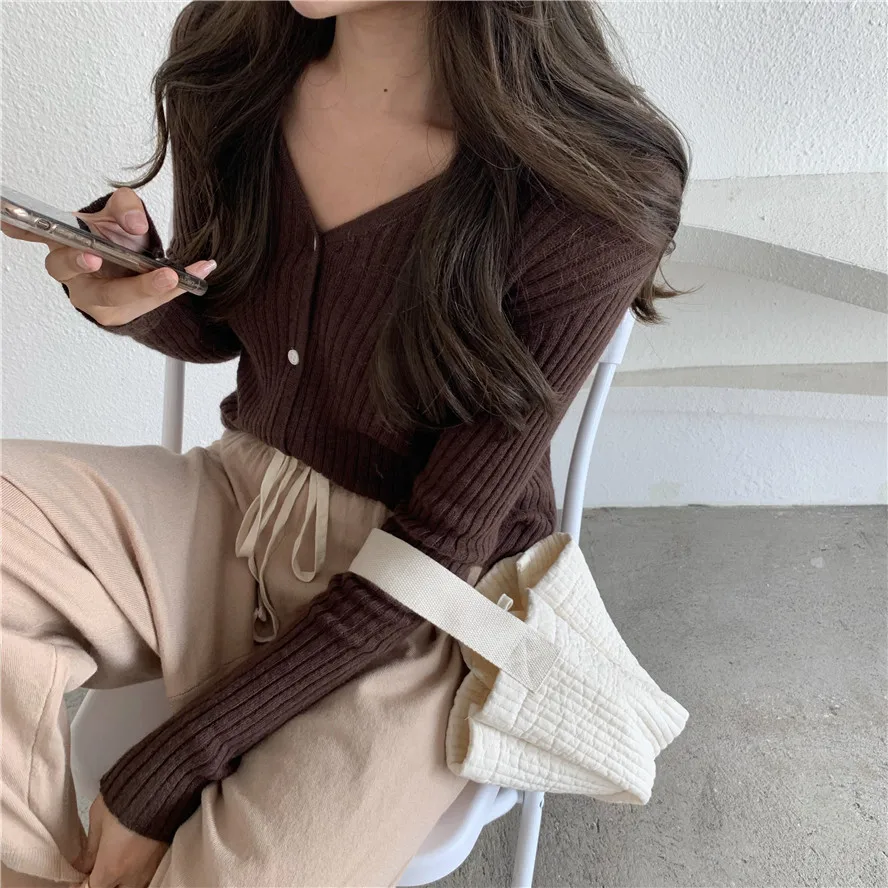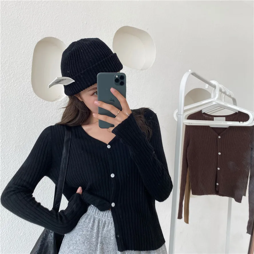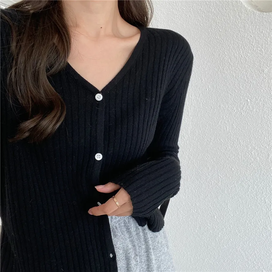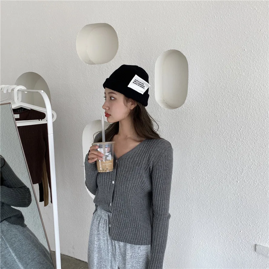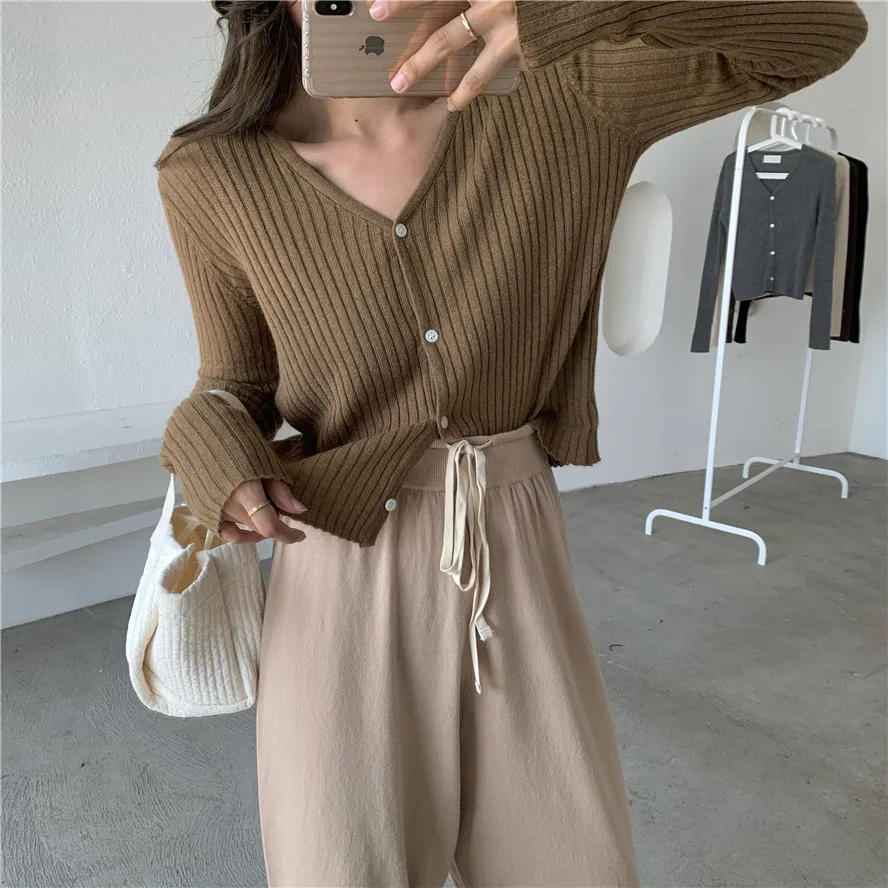 Бежевый, серый, кофейный, черный кардиган для женщин, весна, лето, осень, базовый вязаный свитер с v-образным вырезом, кардиган, корейский короткий кардиган для женщин