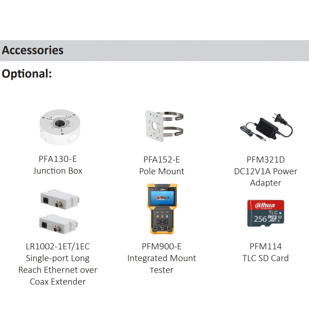 | 8MP Lite IR Vari-focal Bullet Network Camera > 8MP, 1/2.7" CMOS image sensor, low illuminance, high image definition > Outputs max. 8MP (3840 × 2160) @15 fps, and supports 2688×1520 @25/30 fps > H.265 codec, high compression rate, ultra-low bit rate > Built-in IR LED, max IR distance: 60 m > ROI, SMART H.264/H.265, flexible coding, applicable to various bandwidth and storage environments > Rotation mode, WDR, 3D DNR, HLC, BLC, digital watermarking, applicable to various monitoring scenes > Intelligent detection: Intrusion, tripwire > Abnormality detection: Motion detection, video tampering, no SD card, SD card full, SD card error, network disconnection, IP conflict, illegal ac cess, local alarm, voltage detection,audio abnormal > Alarm: 1 in, 1 out; audio: 1 in, 1 out; supports max. 256 GB Micro SD card > 12V DC/POE power support > IP67 protection |