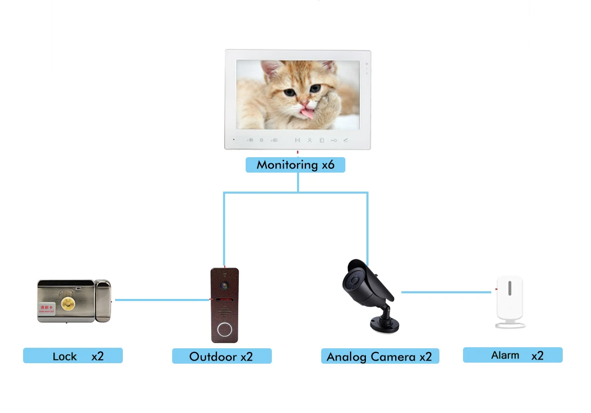 Поддержка до 6 мониторов, 2 панели вызова, 2 камеры видеонаблюдения, 2 будильника и 2 электрических замка.