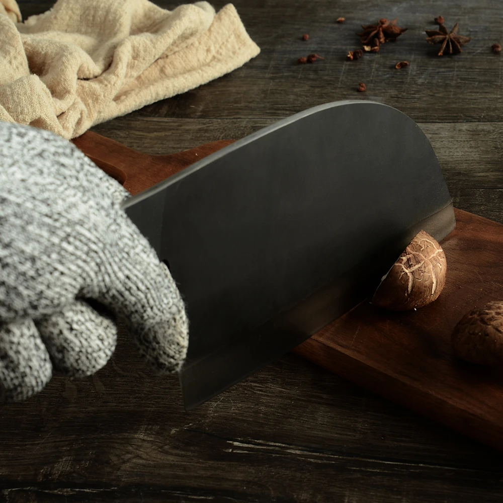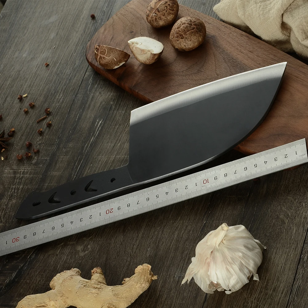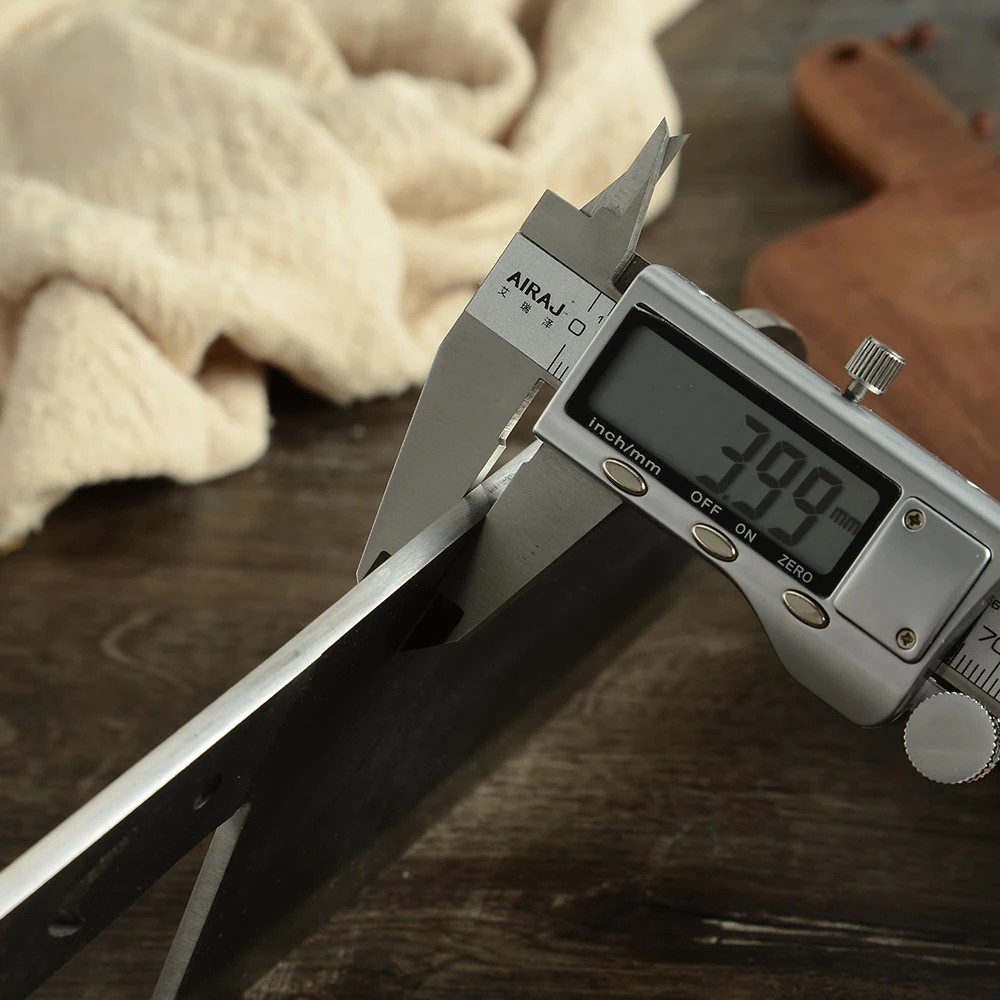 Вес ножа: около 438 г Ширина лезвия: около 100 мм Длина лезвия: около 170 мм Толщина лезвия: около 4,0 мм Стиль ручки: полная ручка Tang Материал лезвия: высокоуглеродистая Нержавеющая сталь 7cr17 ручной работы Обратите внимание: этот нож не подходит для измельчения костей.