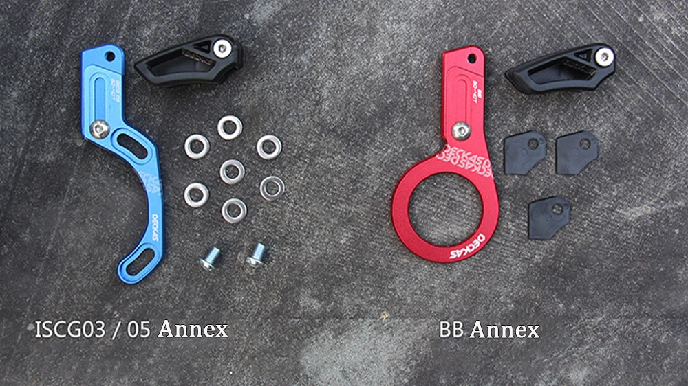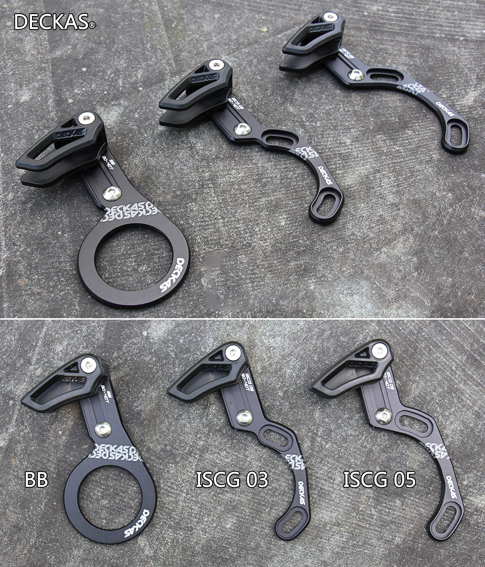 Brand Name: DECKAS Product Name:Bicycle Chain Guide Material: 6061 - T6 aluminum alloy CNC; nylon Perfect for 1x system Plastic top guides, bottom & guard Material: Alloy 6061-T6 full CNC made Spec:screw-type BB axis / ISCG03 / ISCG-05 Range: round :30-40T / oval:30T-38T Weight: BB mount 29g ISCG03 25g ISCG05 26g the mounting holes distance is 47.7mm for the ISCG 03 specifications the mounting holes distance is 55.9mm for the ISCG 05 specifications Package:1 pcs chain guide
