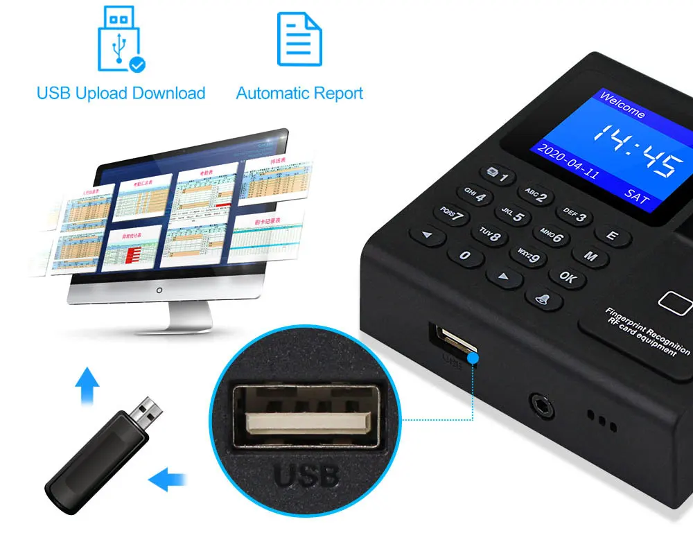Поддержка использования в автономном режимеЭто устройство поддерживает Вход для посещаемости без подключения к сети. Не требуется проводка и подключение к сети. Поддержка использования U-диска для загрузки и загрузки данных отчета о посещаемости. (не включая U-диск)