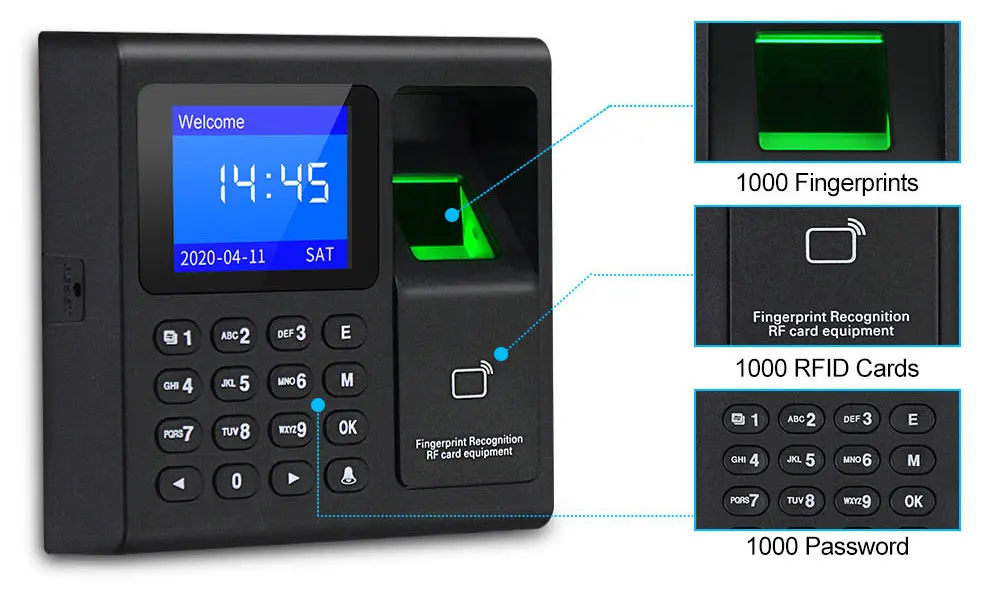 Технология распознавания отпечатков пальцев на 360 градусовДля различных углов отпечатков пальцев, его можно быстро и точно определить,И Быстрая регистрация посещаемости
