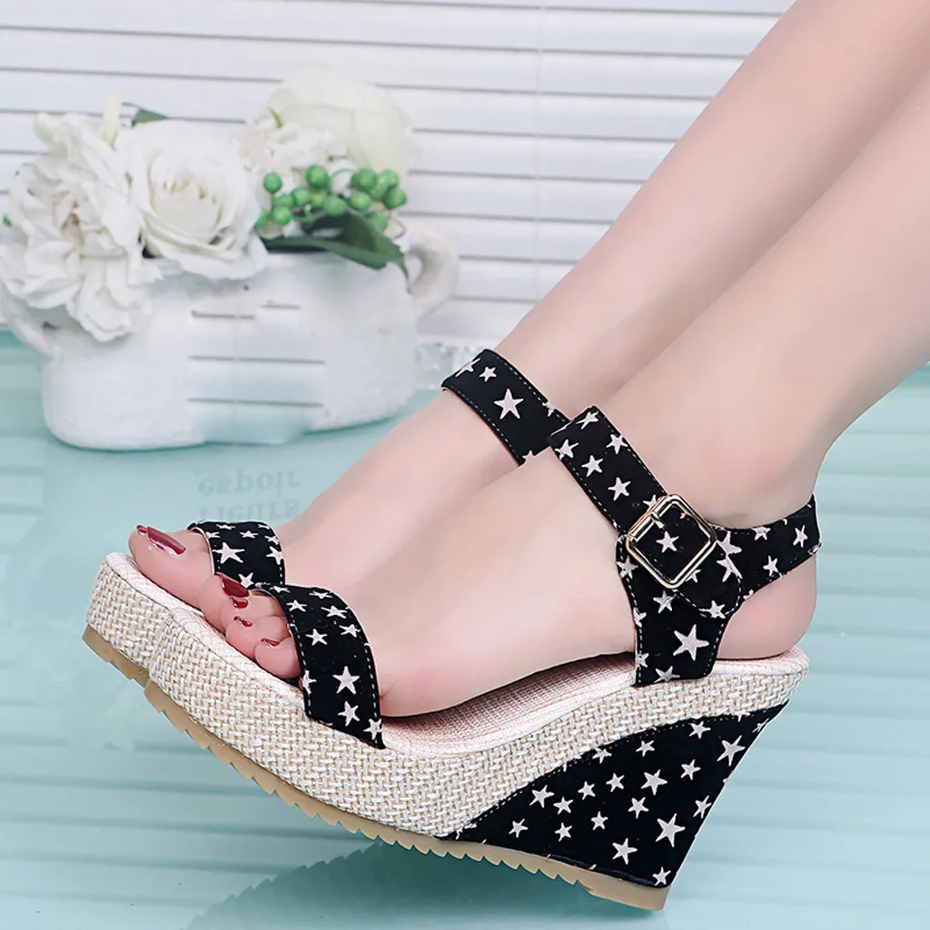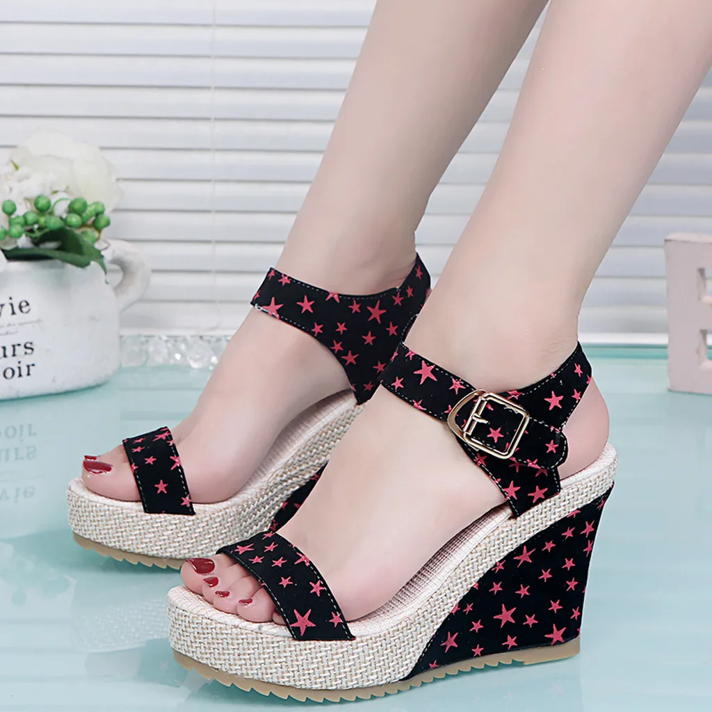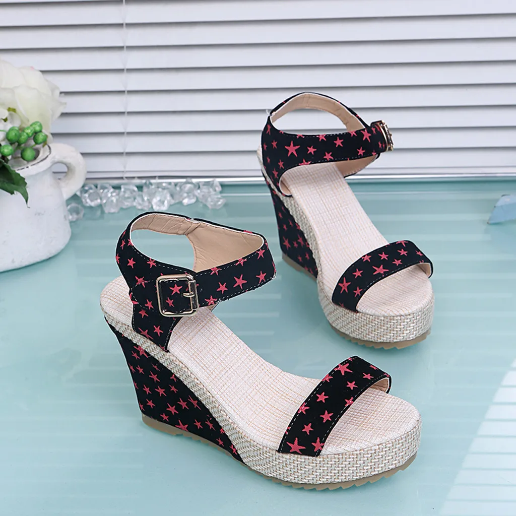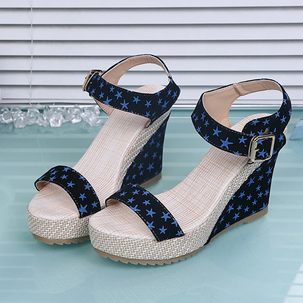Женские босоножки на танкетке и платформе; Обувь на шнуровке с цветочным принтом и звездами