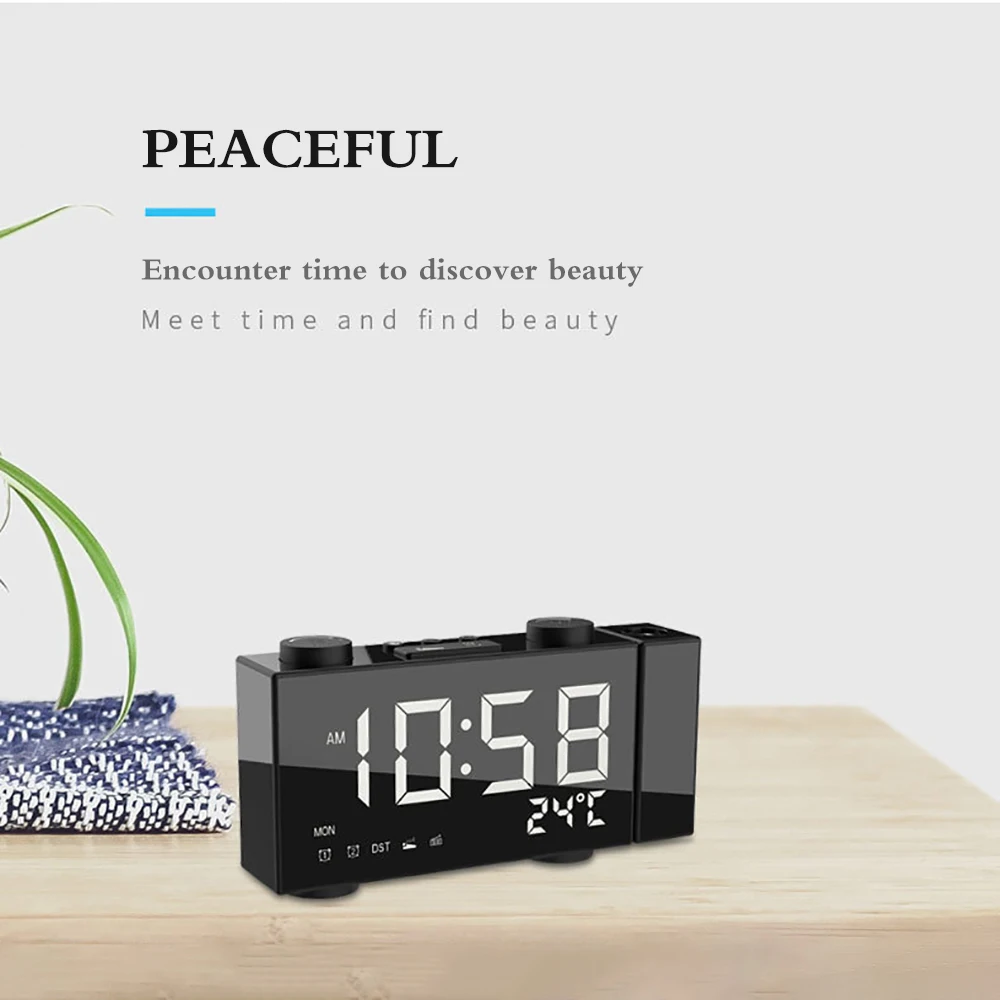 Проекционный будильник имеет функцию fm-радио. Он может автоматически искать станцию или также может быть вручную отрегулирован. Вы можете установить продолжительность радио перед сном.