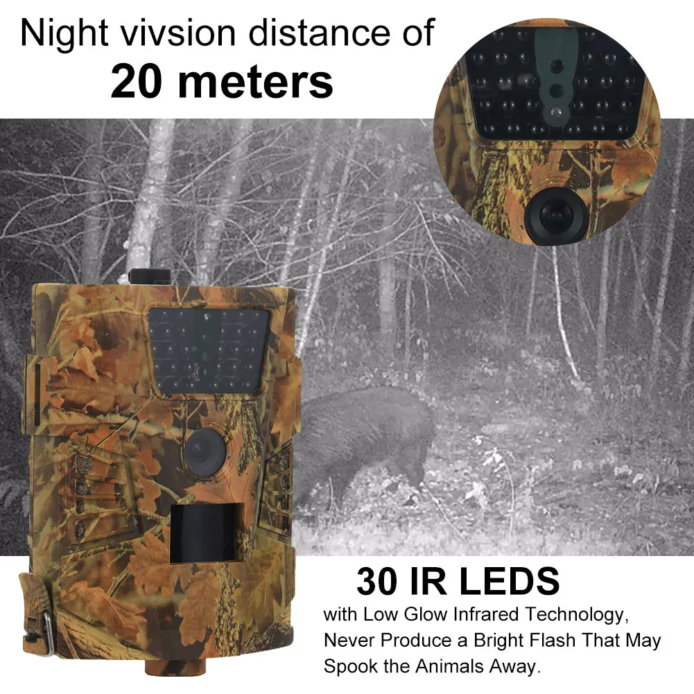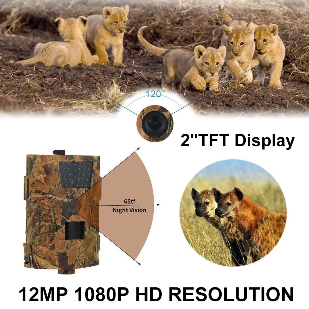 Характеристика: Камера с 120 градусным PIR датчиком, с дополнительным разрешением изображения 12MP / 8mp / 5MP, 720p 30fps видео лента. Инфракрасная камера для съемок природы -1 / 5 / 10 / 30 сек/мин интервал камеры может быть запрограммирован для PIR режим или режим отображаемого времени. -Вспышка цвета/видео день или черный и белый/ночь фото/видео. HD видео со звуком -Фактическая температура, время и дата напечатаны на изображении, так что вы знаете, когда изображение или видео было сделано. -30 ваших светодиодных ИК, Супер дальний диапазон обнаружения 20 метров/66 футов. Время съемки 1,1 секунд, непрерывная быстрой стрельбы, не пропустите ни одного важного картинки. -Он выглядит как водонепроницаемое уплотнение IP65, эффективно предотвращающее появление пыли и дождевых насекомых. -Карта Micro SD (до 32 Гб)/USB / AV исходящая карта (за исключением sd-карты) допускается. -Важные инструменты для охоты, путешествий, кемпинга, отслеживания поголовья/дикой природы. Прост в использовании и езде. -В определенной области, контролируемой датчиком движения, он может быть активирован движением любого человека (или животного). -Легко зафиксировать его на ветке и ветке с помощью фиксированной веревки с пряжкой. Источник света: Один вы четыре щелочные батареи АА Вы четыре максимальное время ожидания Щелочная аккумуляторная батарея AA (не входит в комплект)-6 месяцев, принимая во внимание тот факт, что напряжение перезаряжаемого ni-cd батареи (1,2 V) недостаточно для удовлетворения потребностей этого устройства. Панель солнечных батарей Оригинальная солнечная панель 6 вольт селективный литиевый аккумулятор. 3 адаптер питания Эта камера также может использовать внешний адаптер 6 в CC Посылка список: 1 * Ht-001b камера Безопасность ремень USB-кабель. 1. * Руководство пользователя Примечание: Перед отправкой камеры мы настроили камеру в соответствии с лучшим решением. Если у вас нет особых требований, используйте их напрямую. Если вам нужно настроить камеру, выполните следующие действия: Одна вилка аккумулятора или Подключение внешнего источника питания (используйте соответствующий источник питания) Две вставки новой tf-карты (до 32 ГБ) Три поворота переключателя камеры в режим «test» или «no» и подождите 1-5 минут Четыре включения TF и подключение к компьютеру (не к системному компьютеру IOS) Пять открытых syscfg установите камеру и Установите дату камеры (см. Руководство пользователя) Шесть последних обновлений = 0 обновлений = 1