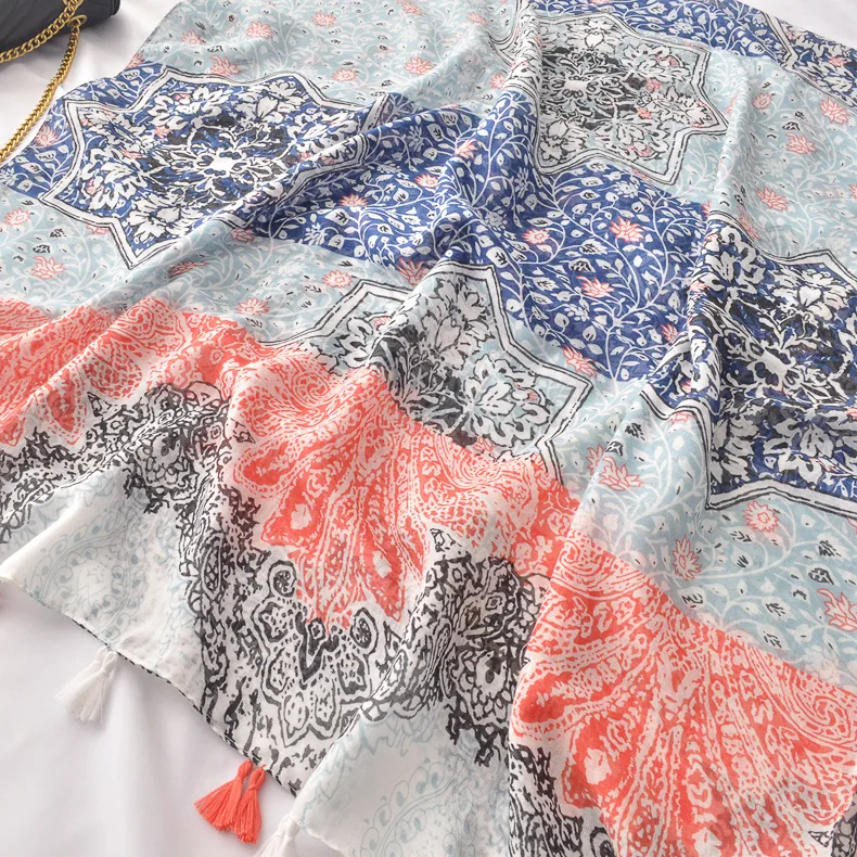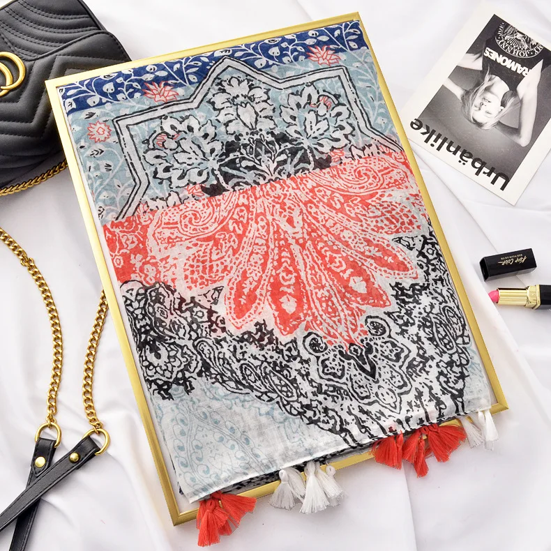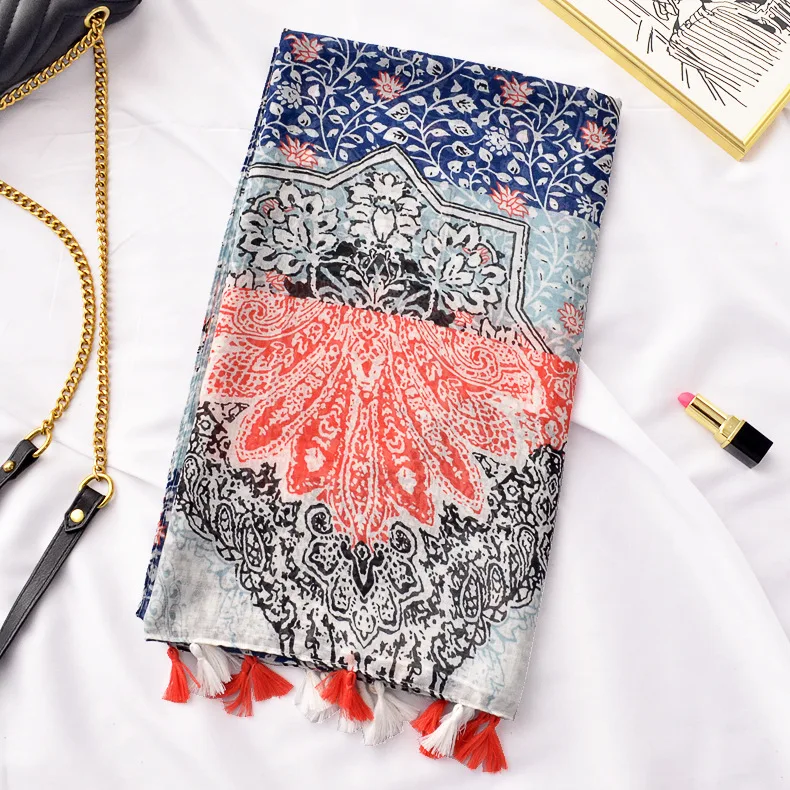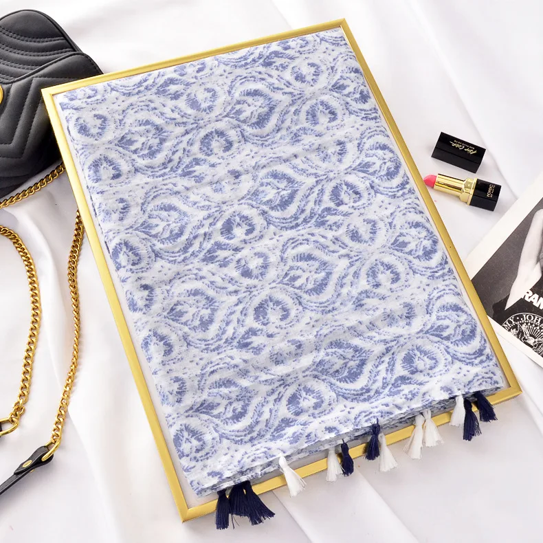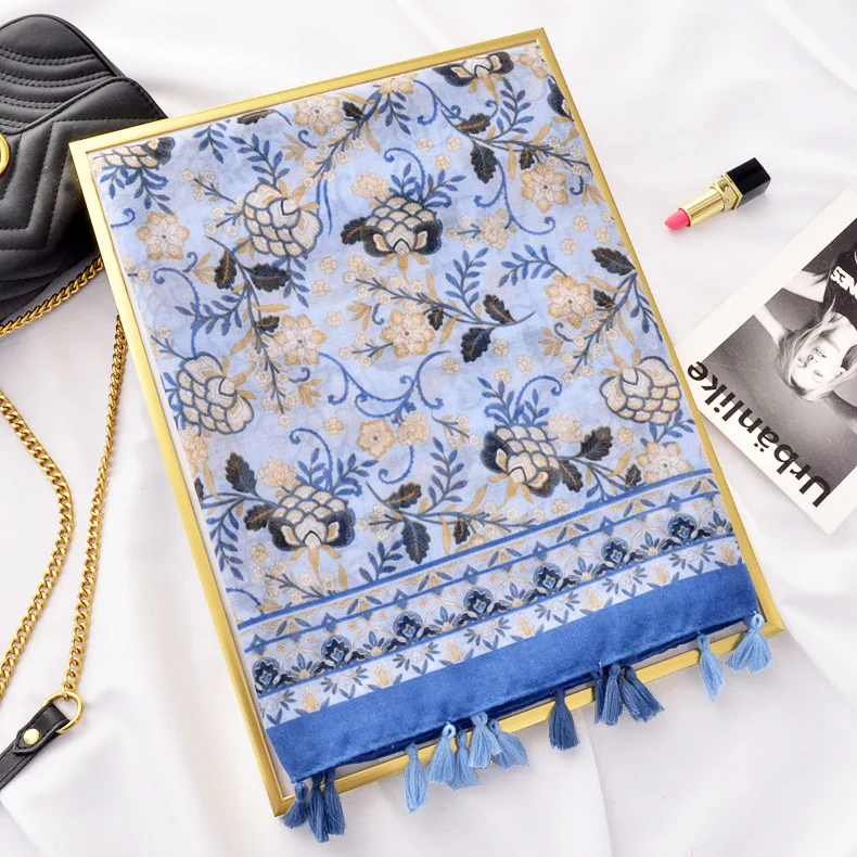 Новый дизайн модный синий и белый фарфор Печать Хлопок и лен шарф шаль женский пляжный Понч с бахромой кисточкой