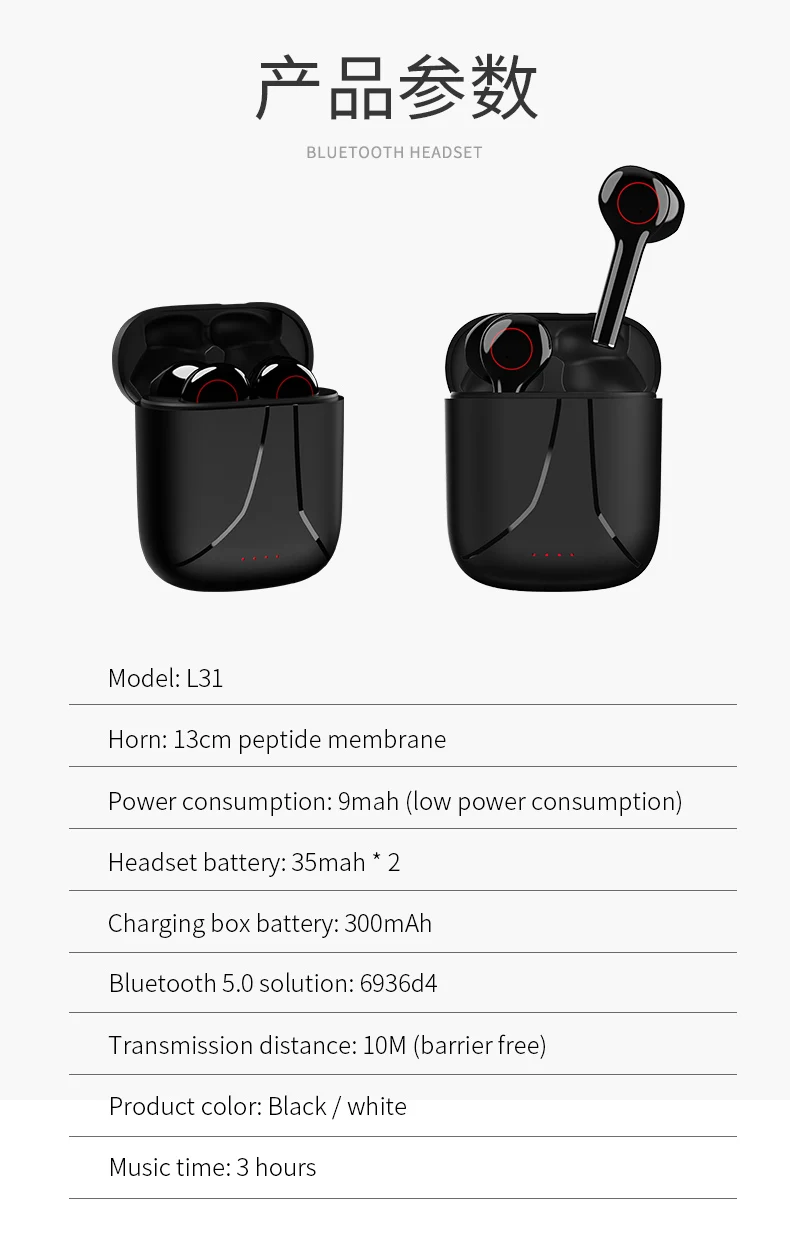 L31 наушники-вкладыши TWS Цвет: черный, белый Тип ношения: в ухе Материал: АБС-пластик Технические параметры Одновременное подключение двух телефонов да Проводное управление: не поддерживает Версия bluetooth: 5,0 Расстояние передачи: 10 м Потребляемая мощность: 9 мА · ч Waterpoorf: Да Сопротивление: 32Ω Частотная характеристика: 20-20 кГц Емкость батареи: наушники: 35 мАч, 3,7 V Зарядный чехол: 300mAh, 3,7 V Время зарядки (ч): 1,5 ч То, что вы нашли время: 3Hrs Время работы (ч): 3 ч Время работы в режиме ожидания (ч): 72 часа Посылка включает в себя: 2 * bluetooth наушники 1 * зарядный чехол 1 * кабель для зарядки 1 * Руководство пользователя Обратите внимание! В связи с ситуацией, возникшей в результате распространения пандемии, в отдаленных районах некоторых стран нет возможности осуществить транспортировку. Время перевозки груза будет немного увеличено, пожалуйста, обратите внимание на покупателей! Время ответа сотрудников службы поддержки клиентов: 9:30 до 8:30 вечера Если вы не можете вовремя ответить на ваш вопрос из-за разницы во времени, Пожалуйста, простите нас и желаем вам приятных покупок ~