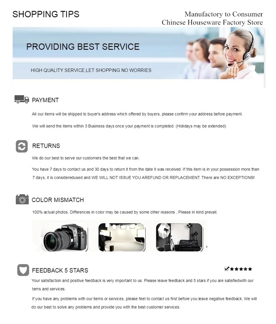 Магазина Manufactory to Consumer Chinese Houseware Factory Store работает с 23.12.2019. его рейтинг составлет 78.3 баллов из 100. В избранное добавили 5916 покупателя. Средний рейтинг торваров продавца 4.2 в продаже представленно 1323 наименований товаров, успешно доставлено 225 заказов. 106 покупателей оставили отзывы о продавце.