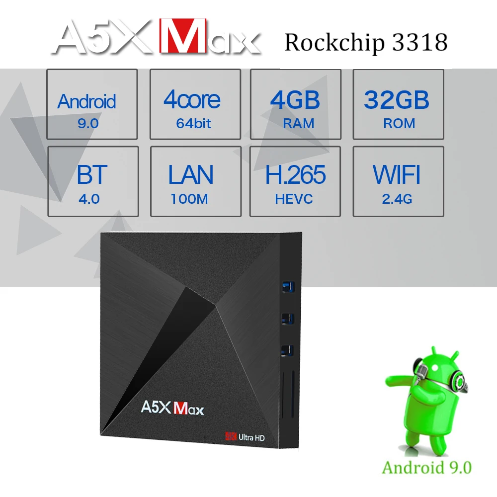 Чипсет RK3318 четырехъядерный 64 бит Cortex-A53 GPU Penta-Core Mali-450 Up Флеш-память EMMC 32 Гб SDRAM (синхронное динамическое ОЗУ 4 Гб DDR3 Питание Технические характеристики Источник питания DC 5V/2.5A Индикатор питания (светодиодный) Включение питания: синий; Режим ожидания: красный Основные Особенности ОС Android 9,0 Поддержка декодера формат 4K VP9 видео декодер, H.265/H.264 видео декодер 1080P другие декодеры видео (VC-1, MPEG-1/2/4, VP6/8) Поддержка медиа формата Avi/Ts/Vob/Mkv/Mov/ISO/wmv/asf/flv/dat/mpg/mpeg Поддержка музыкального формата MP3/WMA/AAC/WAV/OGG/DDP/HD/FLAC/APE Поддержка формата фото HD JPEG/BMP/GIF/PNG/TIFF Режимы HDR HDR10 и HLG USB 1 Высокоскоростной USB 3,0 и 3 высокоскоростной USB 2,0 Устройство для чтения карт SD карты HDD файловая система FAT16/FAT32/NTFS Поддержка подзаголовка SRT/SMI/SUB/SSA/IDX + USB Видео выход высокой четкости 4K (4096x2160 пикселей) OSD тип языков английский/французский/немецкий/испанский/итальянский/и т. Д. LAN Ethernet: стандарт 100/1000 RJ-45 Беспроводной 2,4G Wifi + Bluetooth Поддержка Bluetooth Мышь/клавиатура Поддержка Мышь и клавиатуры через USB; Поддержка 2,4 ГГц беспроводной Мышь и клавиатура через 2,4 ГГц USB донгл HDMI 2.0a для 4k @ 60Hz AV Поддержка SPDIF/IEC958 коаксиальный кабель Спецификации программного обеспечения Сетевая функция Neflix,Vudu,Skype Чат, Picasa, мерцание, Youtube,Facebook, онлайн фильмы и т. Д. Другие функции бесплатный поиск в Интернете, тысячи приложений android, много видов игр и т. Д. Сертификация CE,FCC,ROHS Аксессуары адаптер питания, HDMI кабель, руководство пользователя, пульт дистанционного управления Вариант Поддержка мыши и клавиатуры через USB; Поддержка 2,4 ГГц Беспроводная мышь и клавиатура через 2,4 ГГц USB донгл 4 1. Кабель HDMI * 1 2. Пульт дистанционного управления * 1 3. Руководство пользователя * 1 4 、 посылка коробка * 1 5. Адаптер питания * 1