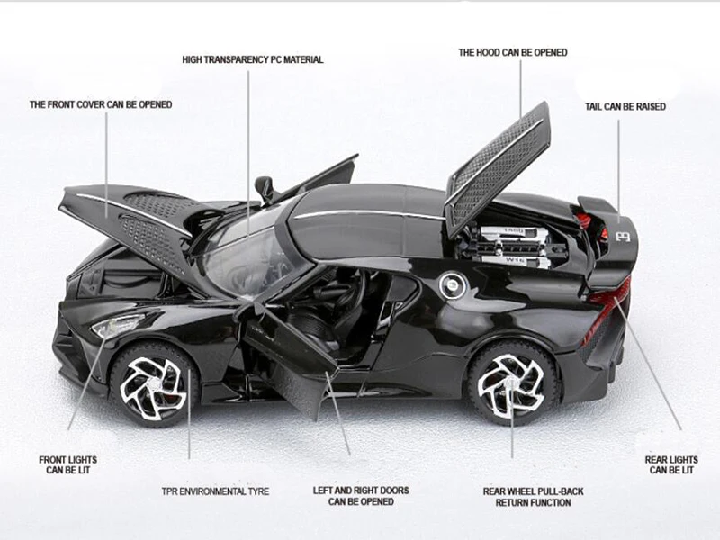 Цвет: красный, белый, матовый черный, яркий черный Материал: сплав и АБС Функция: звук и светильник Масштаб: 1:32 Размер: около (15,2 см * 6,5 см * 4 см) Упаковка: модель автомобиля из сплава 1/32 (аккумуляторы в комплект не входят)