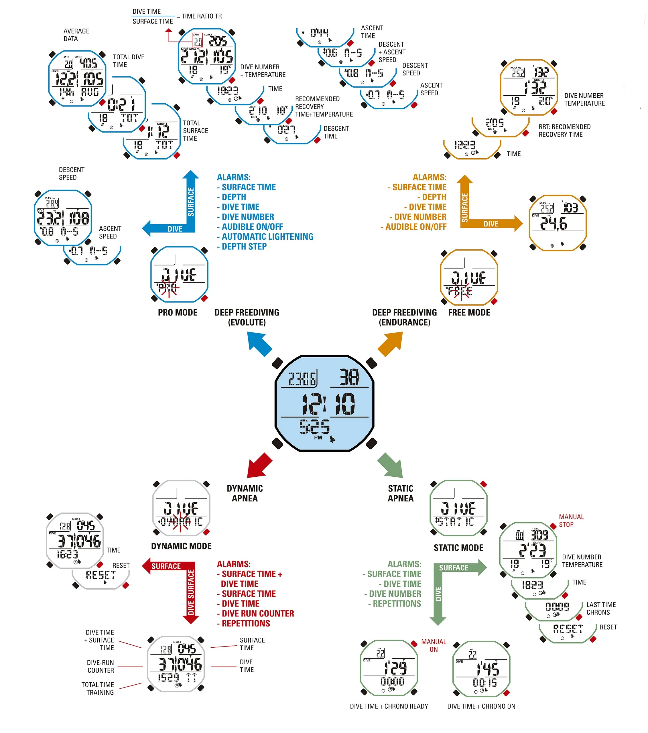 -Четыре функциональных режима: статический, динамический, свободный и PRO -9 воспоминаний в одном режиме для программирования 9 различных конфигураций будильника. Полная конфигурация настроек будильника: время, глубина, количество спусков или серия пулов -Акустические и визуальные сигнализации, полностью управляемые -Расширение REPS для статических и динамических программ для создания и хранения обычных или инкрементных тренировочных таблиц -Точный Секундомер с функциями разделения времени и круга -Настройки соленой и пресной воды -Баттер может быть изменен пользователем Журнал журналов по сеансам -Три исторические функции, содержащие статические, динамические и глубокие данные регистрации при апноэ -Возможность настройки времени выборки -Обмен метрической измерительной единицы (метры и °C) на Системный блок imperial (ft- °F) может быть выполнен пользователем -Интерфейс PC/Mac с общей информацией и погружным профилем (опционально)