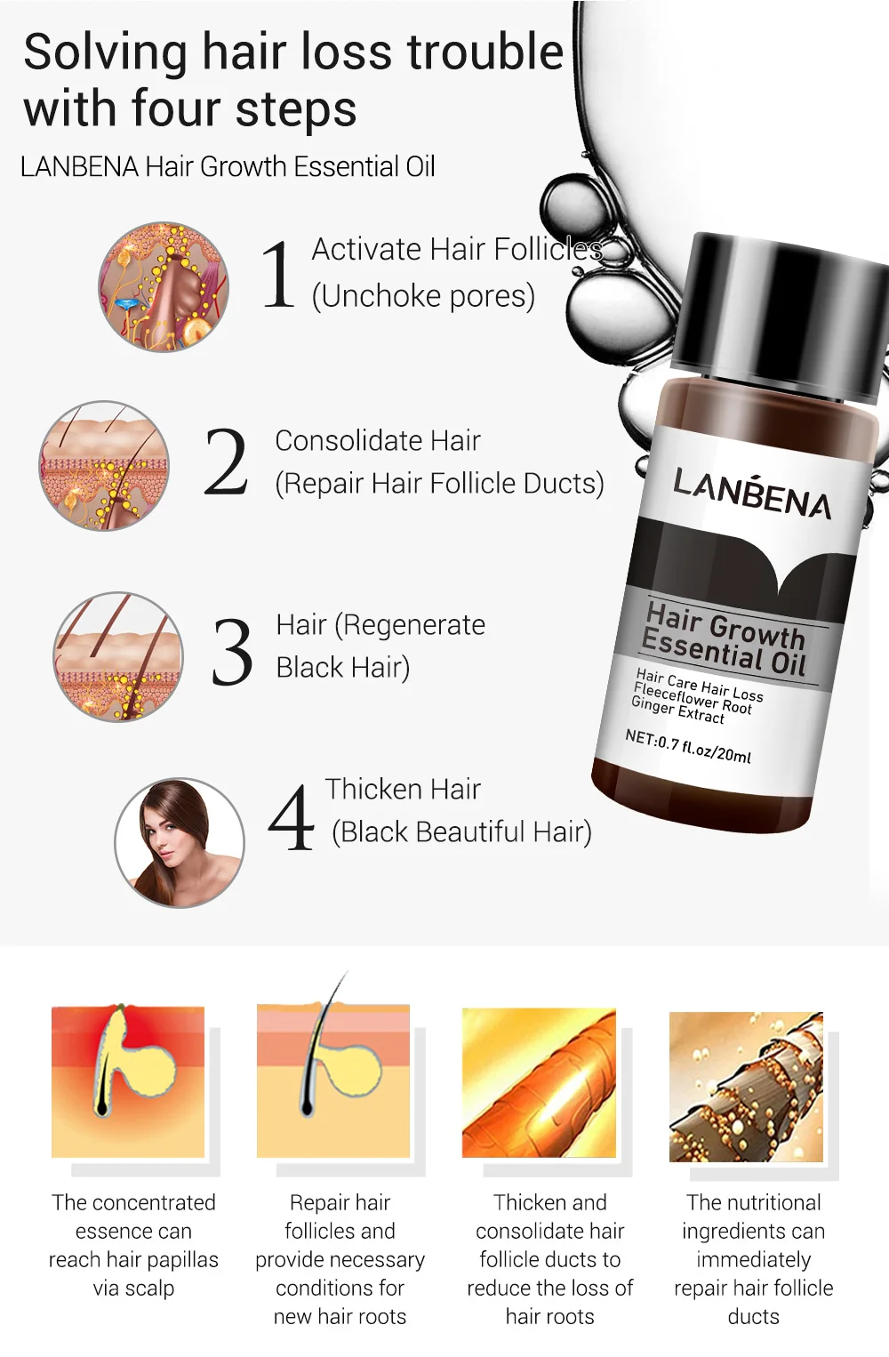 Устранение проблем с выпадением волос четырьмя шагами LANBENA эфирное масло для роста волос Активировать волосяные фолликулы (Unchoke pores) Укрепляет волосы (восстанавливает волосяные фолликулы) Волосы (восстанавливают черные волосы) Утолщенные волосы (черные красивые волосы) Концентрированная эссенция может достигать папиллы для волос через кожу головы Восстанавливает волосяные фолликулы и обеспечивает необходимые условия для новых корней волос Утолщенные и укрепляющие волосяные фолликулы для уменьшения выпадения корней волос Питательные ингредиенты могут немедленно восстановить волосяные фолликулы