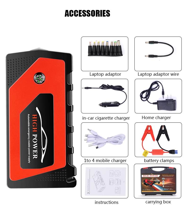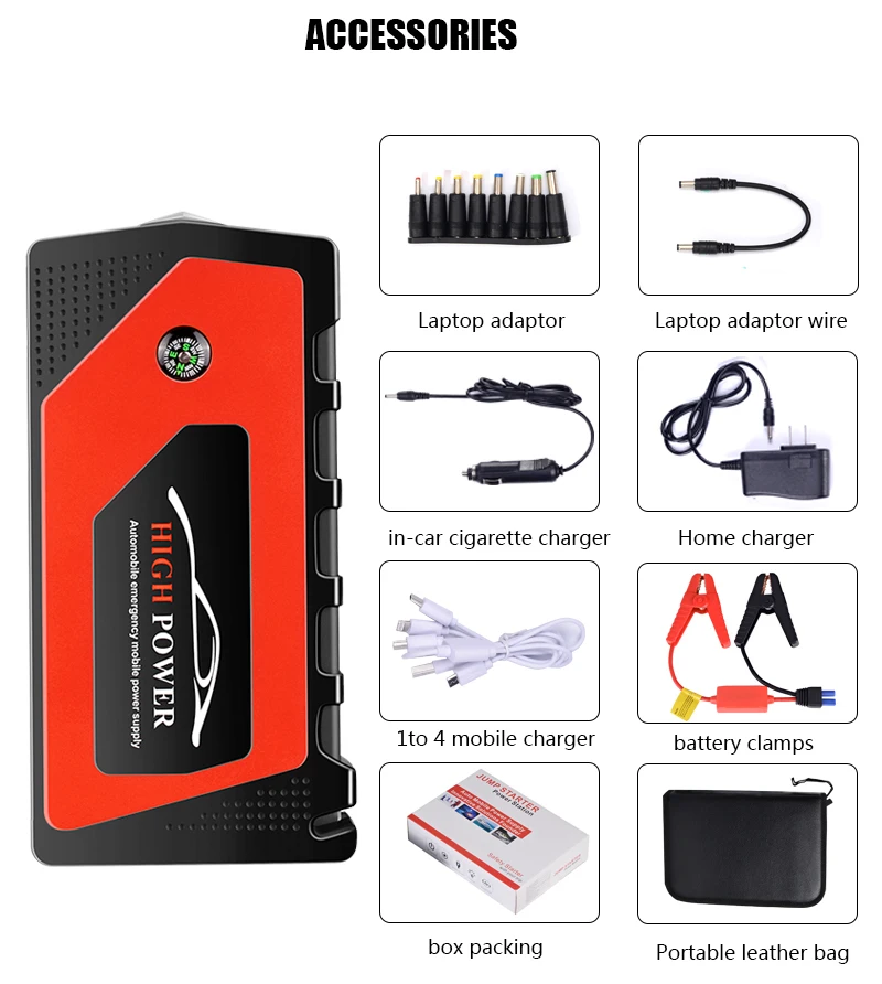 1 * зарядное устройство, 1 * зажим для запуска автомобиля, 1 * Мобильный телефон-адаптер, 8 * адаптер для зарядки ноутбука, 1 * Автомобильное зарядное устройство, 1 * домашнее зарядное устройство, 1 * сумка для инструментов, 1 * Руководство пользователя
