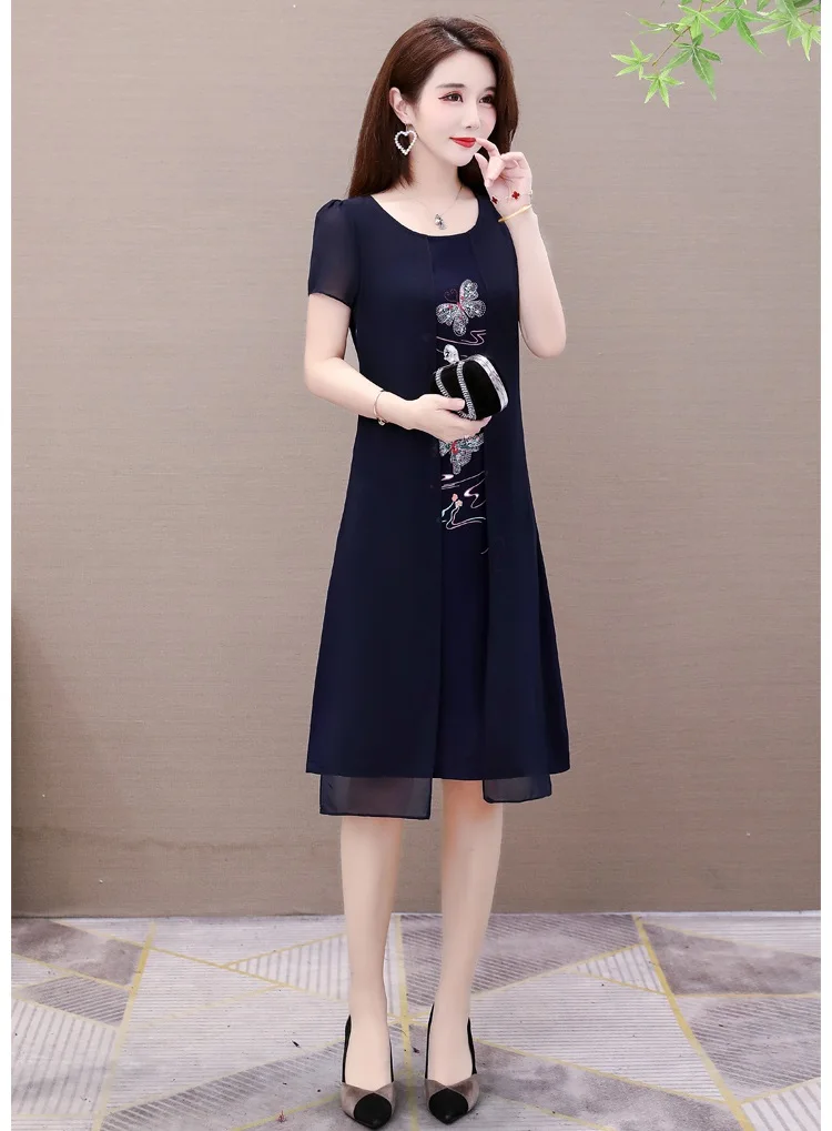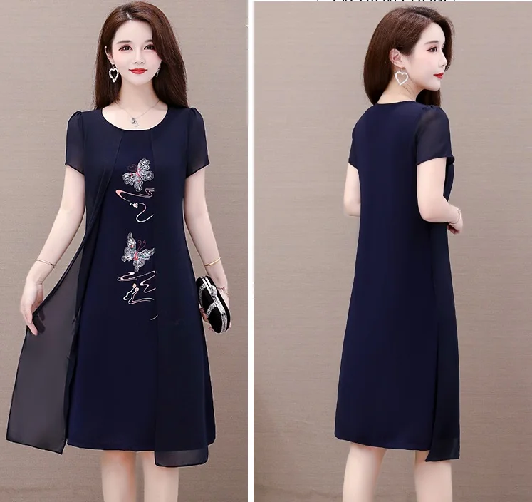 UHYTGF Элегантное летнее платье для мамы корейское Модное шифоновое платье с имитацией двух частей пуловер с круглым вырезом женское свободное платье 5XL размера плюс 844