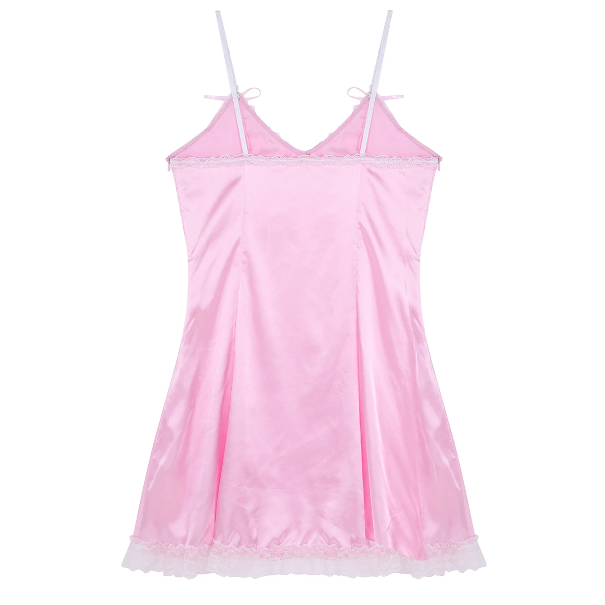 Регулируемые бретели-спагетти, v-образный вырез и заниженная спинка, с оборками по кружевному подолу.