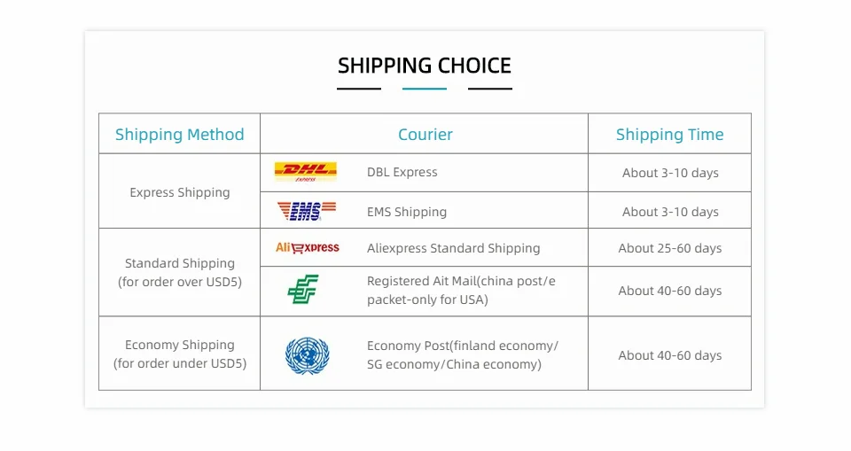 Настоятельно рекомендуется:Aliexpress Стандартная доставка, Epacket, Почта Китая зарегистрированная Авиапочта, (Нормальная ситуация: прибытие в пункт назначения около 16-35 дней, за исключением особых обстоятельств (включая, но не ограничиваясь: форс-мажор, таможенная инспекция, корректировки политики, праздники и т. Д.) срок доставки запроса: //ilogistics.aliexpress.com/recommendation_engine_public.htm)