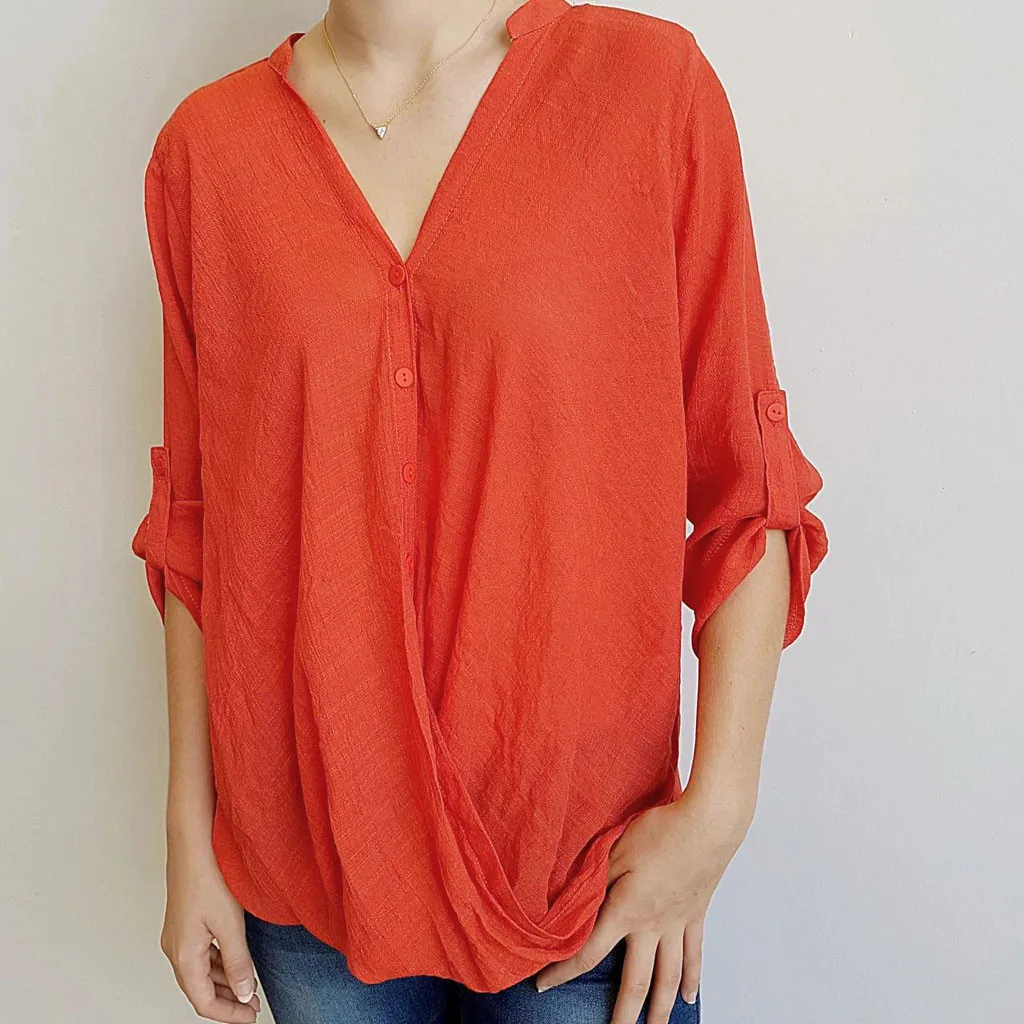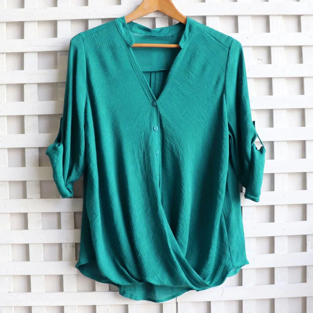 Вкладыши мягко вставляются в сложенном виде ткань Создает лестную драпированную блузку на пуговицах, которая еще свободно сидит С женственные формы.