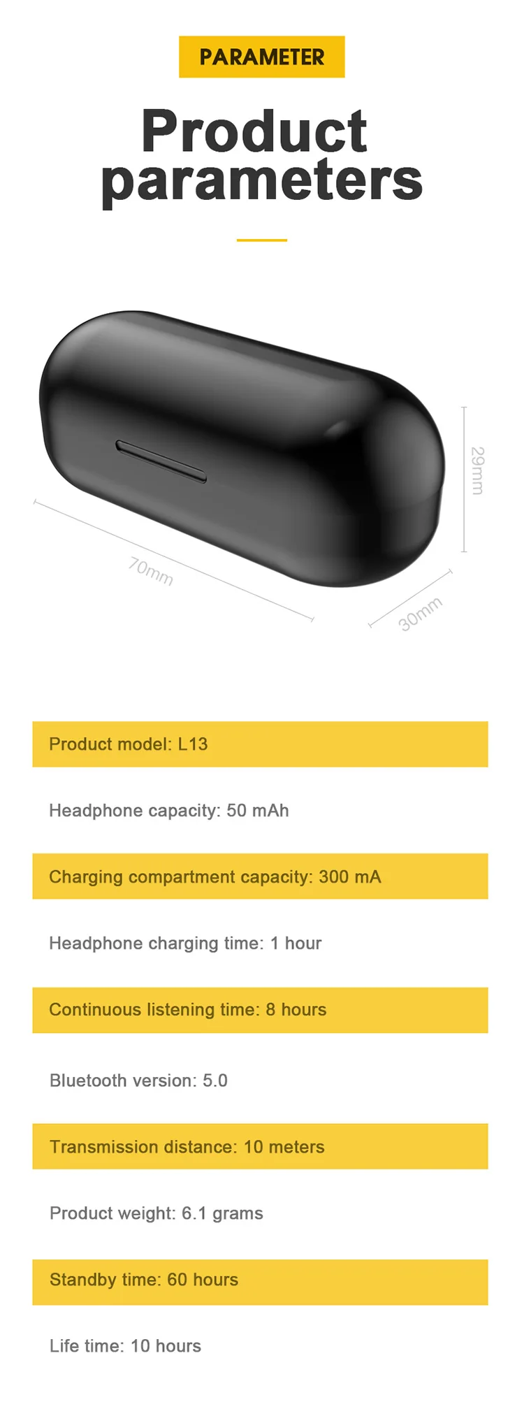 L13 наушники-вкладыши TWS 1. Версия Bluetooth: двухрежимный Bluetooth v5.0 2. Соглашение о поддержке: A2DP1.3 / HFP1.6 / HSP1.2 / AVRCP1.6 / D11.3 3. Способ ношения: затычки для ушей 4. Расстояние передачи Bluetooth: 10-15 метров 5. Емкость батареи: как левые, так и правые уши встроены в 50 мА · ч специальный Подгонянный литий-полимерный аккумулятор, и емкость аккумулятора зарядного устройства составляет 300 мА · ч 6. Время работы в режиме ожидания: 100 часов в режиме ожидания в одном ухе, 60 часов в режиме ожидания в обоих ушах 7. Чип: Zhongke Lanxun 8. Время разговора и воспроизведения: одно ухо время воспроизведения около 4-5 часов, бинауральное воспроизведение и время разговора Около 2-3 часов, поддержка идентификатора звонящего, система IOS дисплей питания 9. Время зарядки: около 2 часов 10. Дисплей батареи, голосовое управление, функция вызова, Поддержка музыки, функция NFC, Многоточечное соединение Обратите внимание! В связи с ситуацией, возникшей в результате распространения пандемии, в отдаленных районах некоторых стран нет возможности осуществить транспортировку. Время перевозки груза будет немного увеличено, пожалуйста, обратите внимание на покупателей! Время ответа сотрудников службы поддержки клиентов: 9:30 до 8:30 вечера Если вы не можете вовремя ответить на ваш вопрос из-за разницы во времени, Пожалуйста, простите нас и желаем вам приятных покупок ~