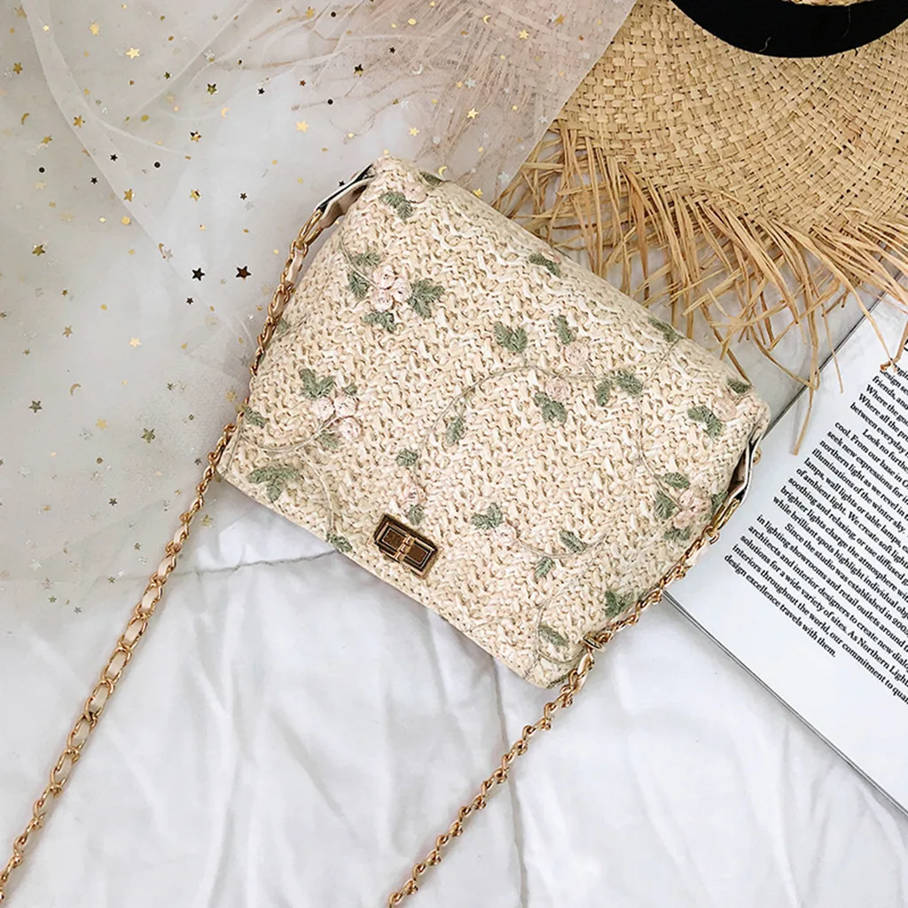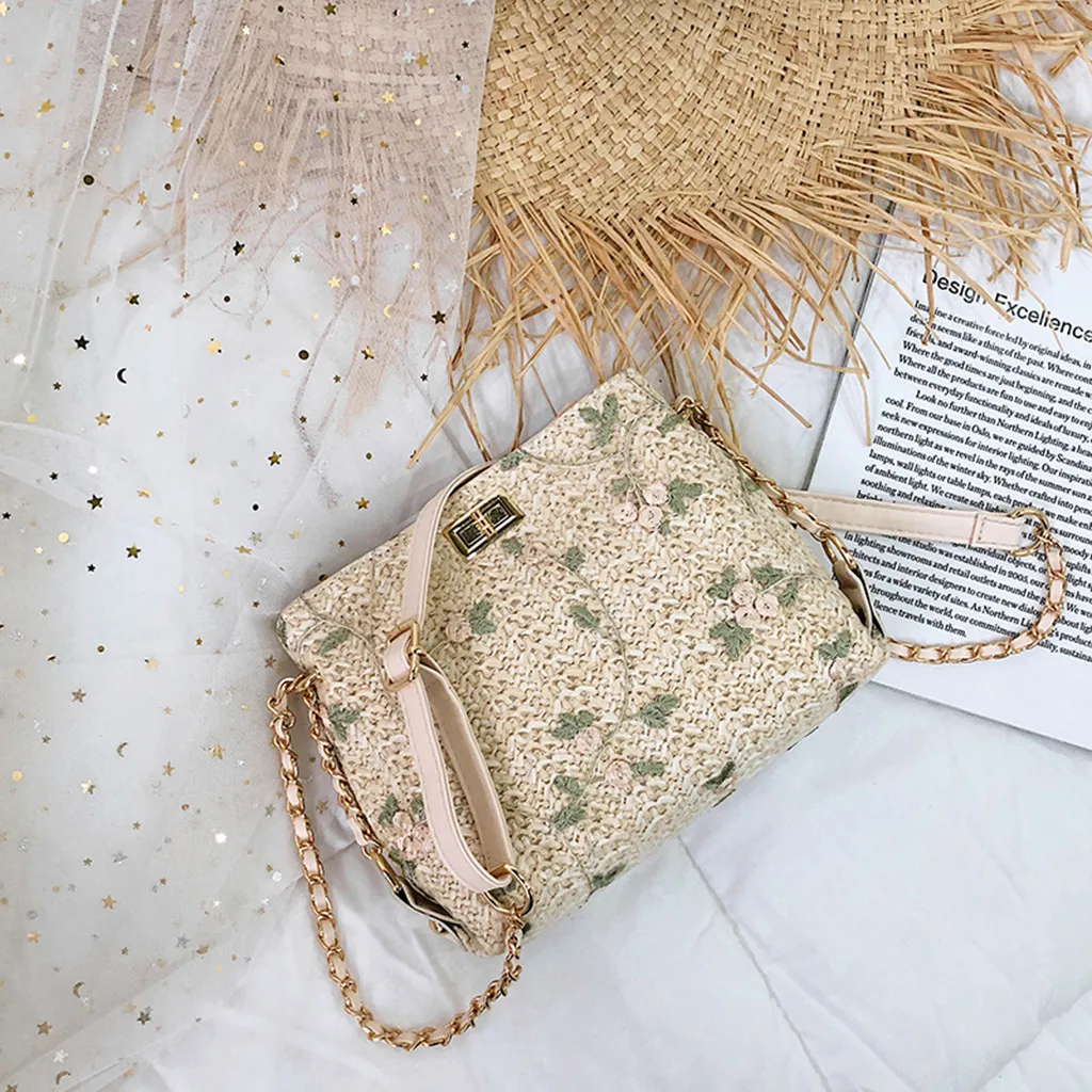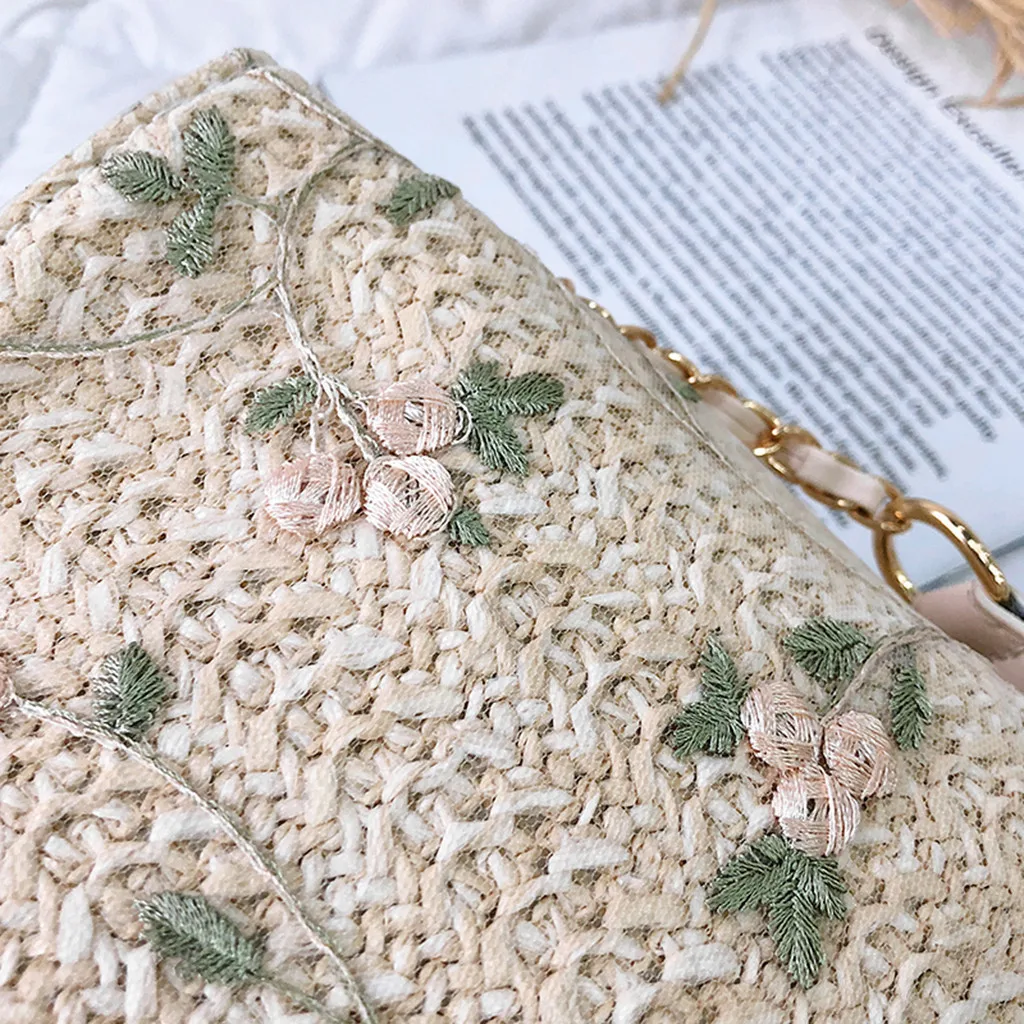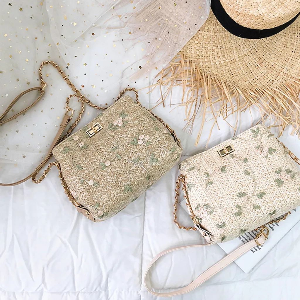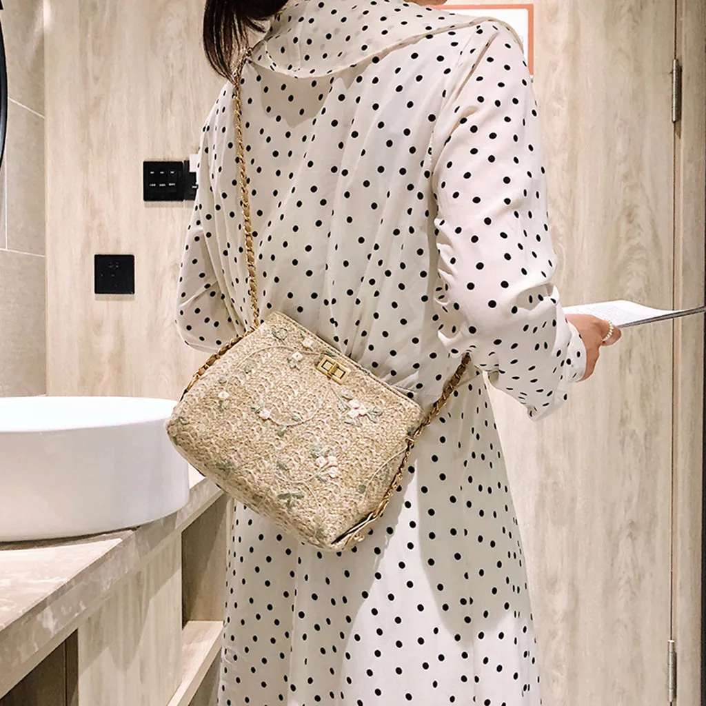 Женская пляжная Соломенная Сумка-ведро с вышивкой, квадратная сумка-мессенджер