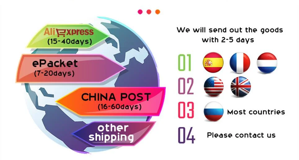 Мы используем EMS /AliExpress Стандартная доставка/Почта Китая авиапочтой/CPAM/Fedex в соответствии с вашим местоположением, и вы получите номер отслеживания в течение 1-5 дней после доставки.